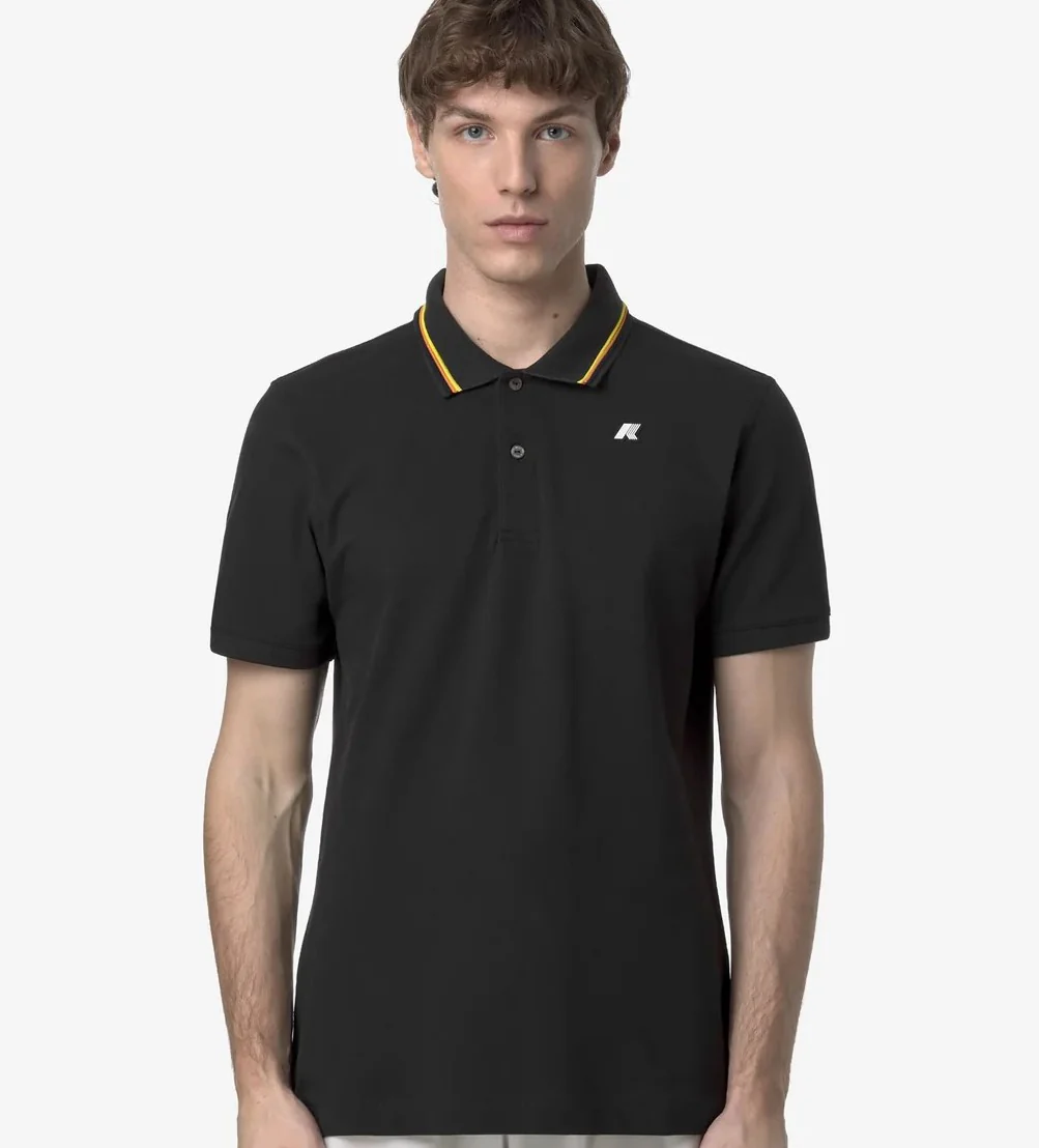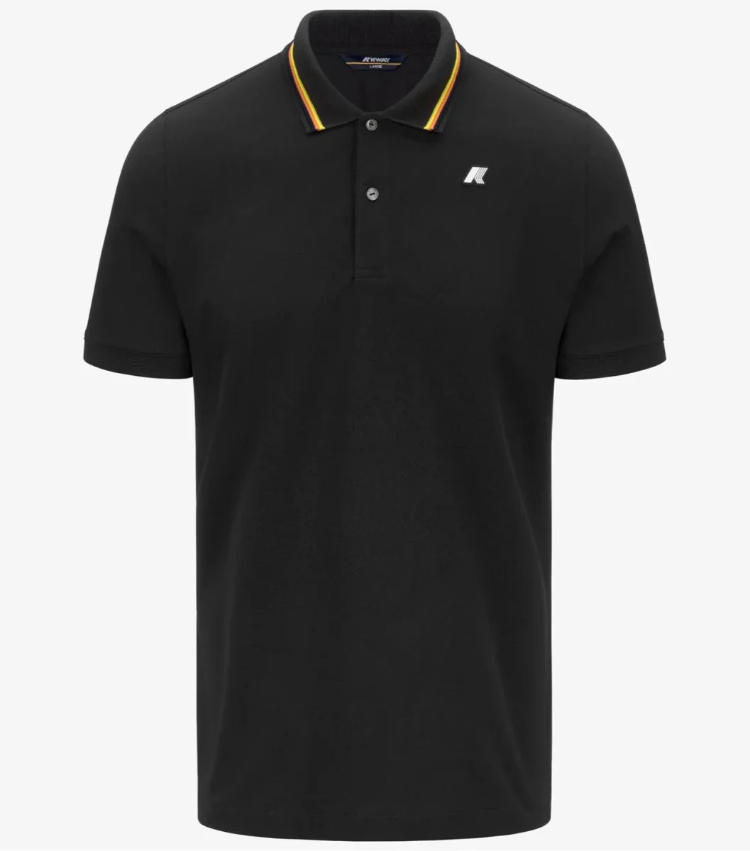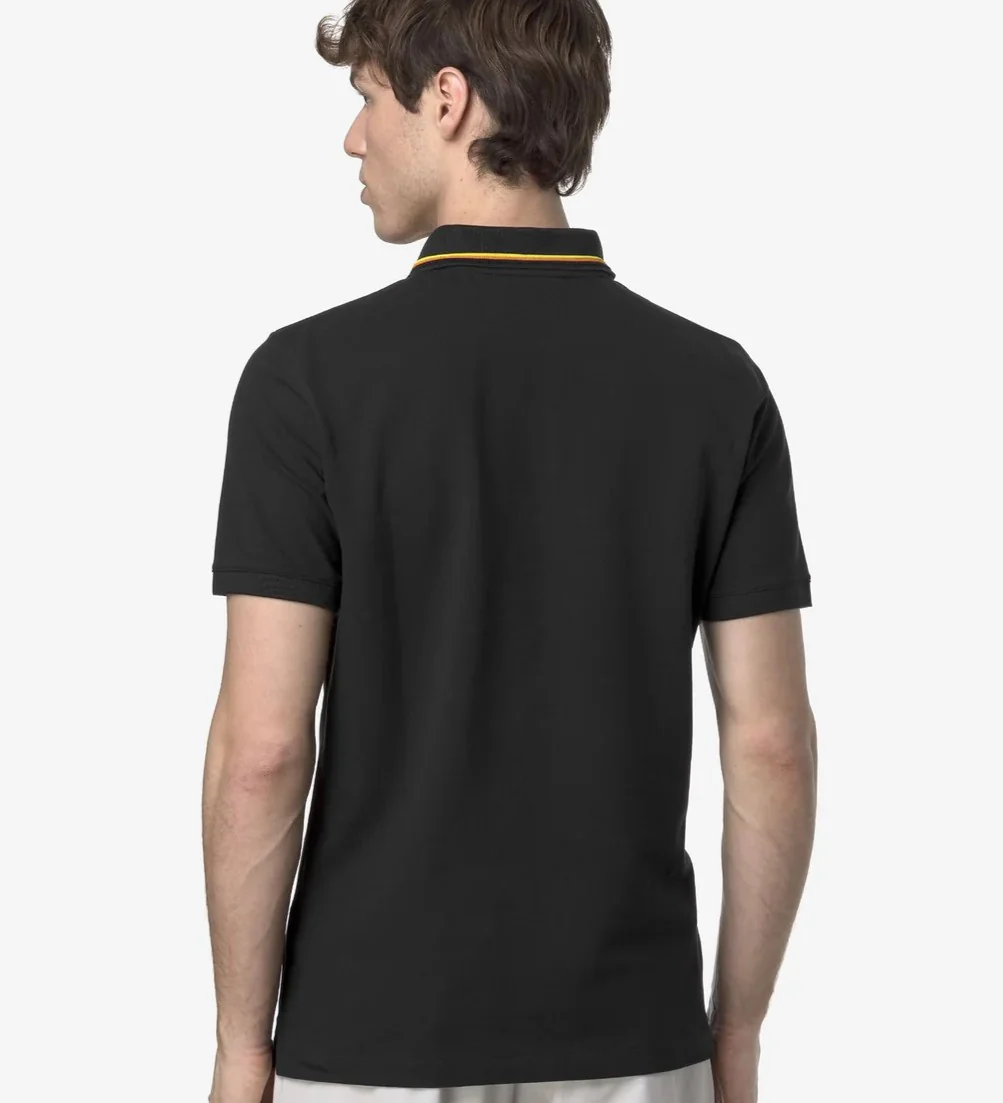 Polo uomo nera in piquet di cotone stretch, caratterizzata da bordo del colletto a righe e spacchetti sui lati, finta a due bottoni in madreperla e logo in silicone. Vestibilitร slim.