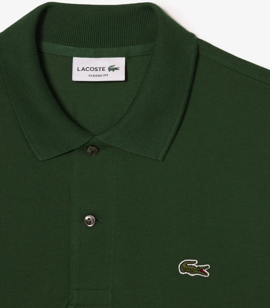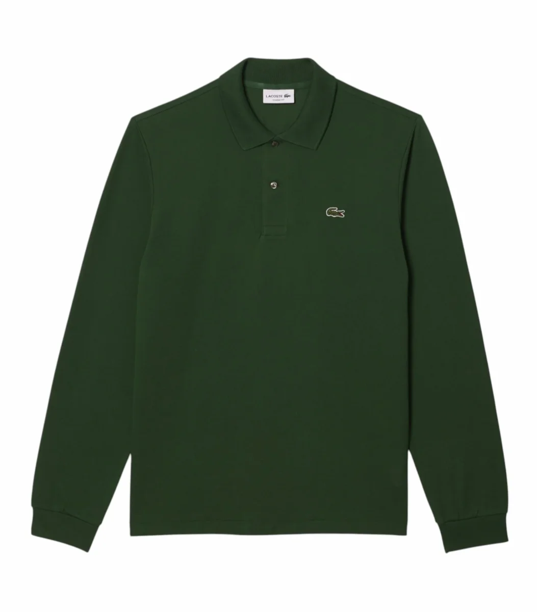 Polo maniche lunghe da uomo, verde in spesso piquรจ di cotone. Modello dal taglio classico con collo a due bottoni, bordi a costine su collo e maniche e bottoni madreperla.