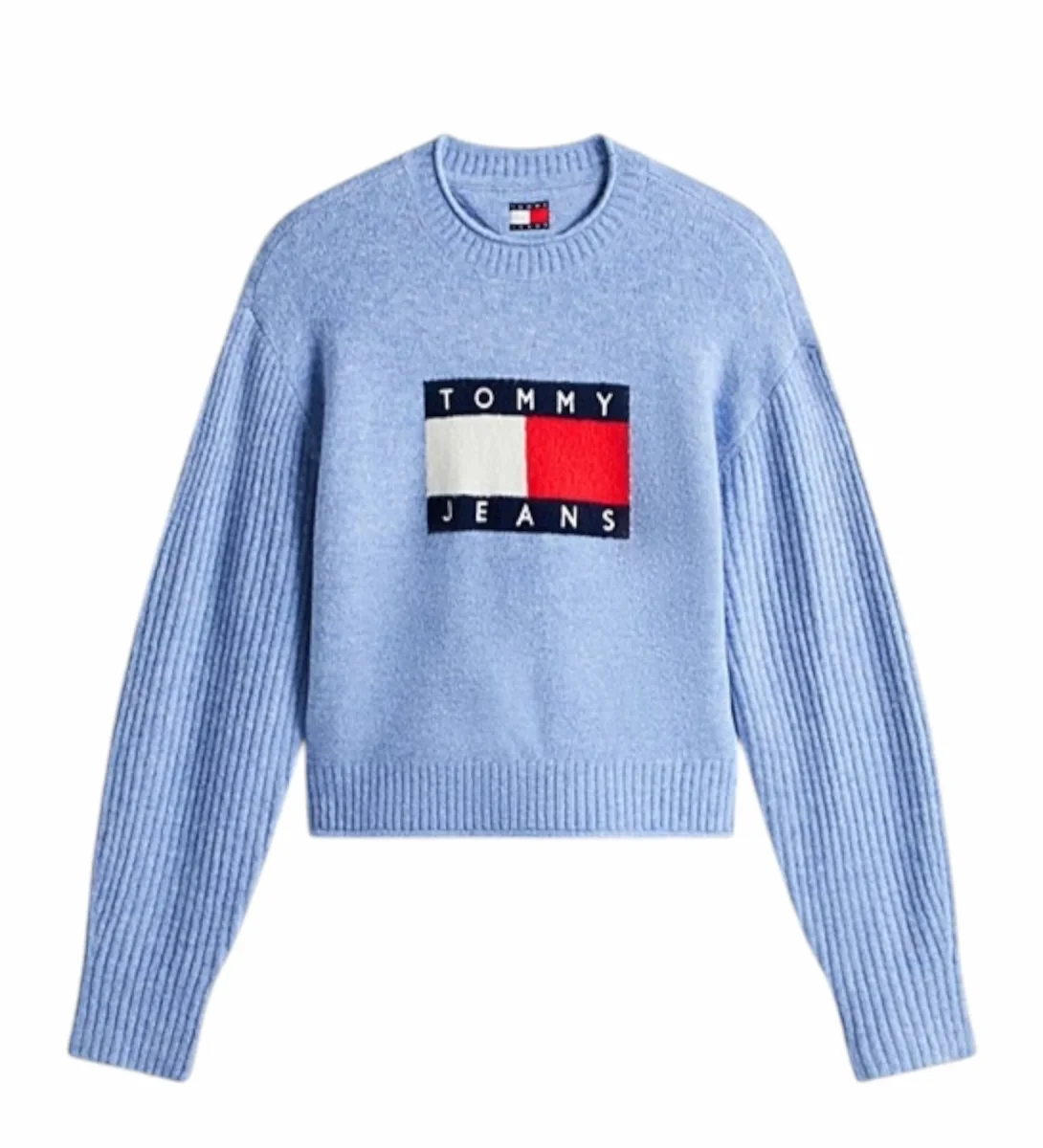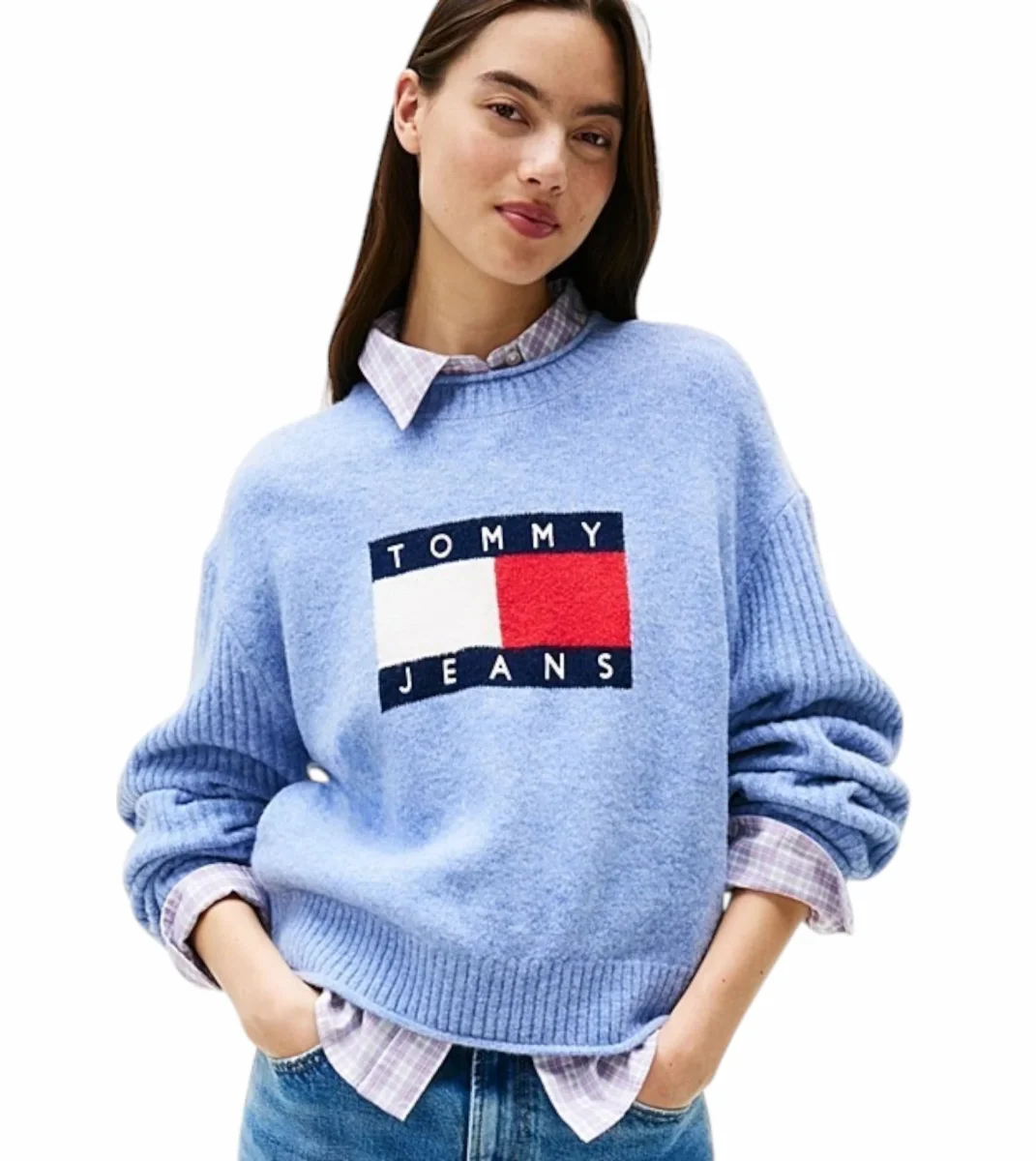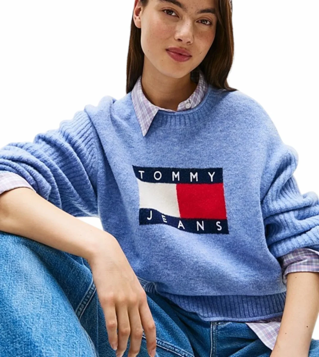 Pullover donna colore iris in misto lana mélange, dal taglio morbido, scollatura rotonda, collo, maniche e fondo in maglia a coste, con vivace bandiera Tommy colorata sul davanti. Vestibilità rilassata, spalle scese.