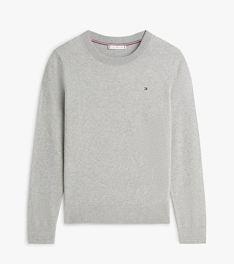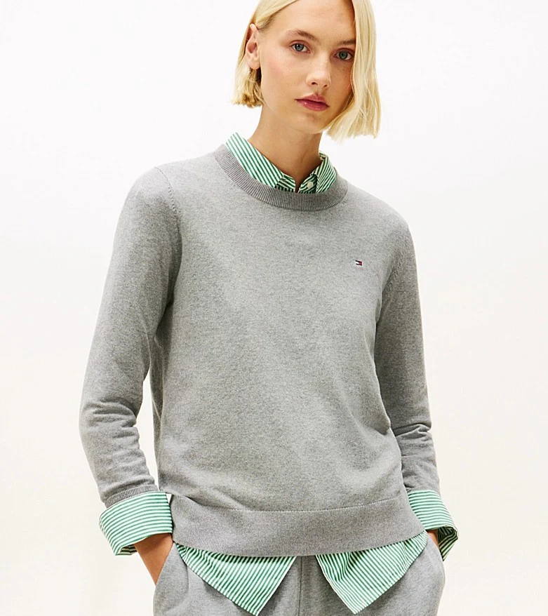 Pullover donna grigio realizzato in jersey di puro cotone pettinato in maglia sottile con cuciture decorative sui polsini e bandierina ricamata sul petto.