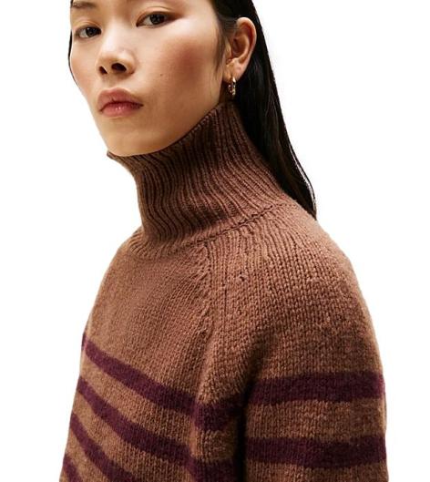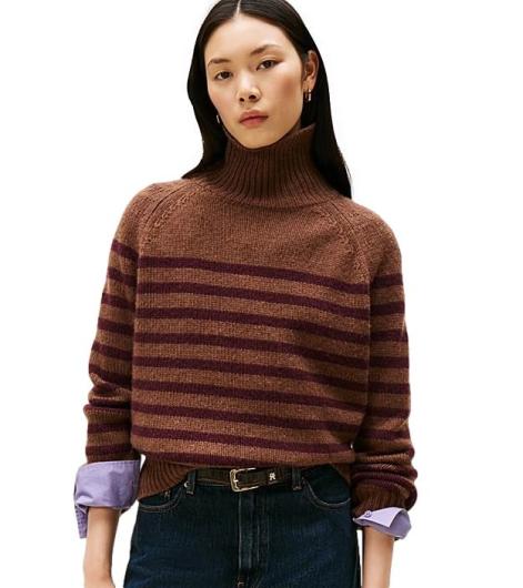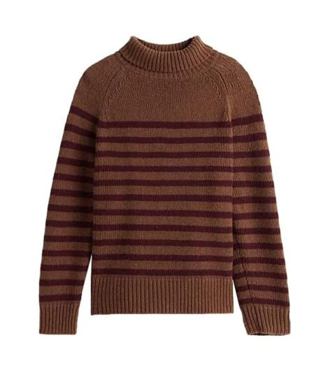 Pullover donna marrone a strisce rosse realizzato in misto lana e cashmere, in maglia grossa con collo dolcevita, monogramma logo tono su tono sul retro. Modello dalla vestibilitร rilassata con maniche reglan.
