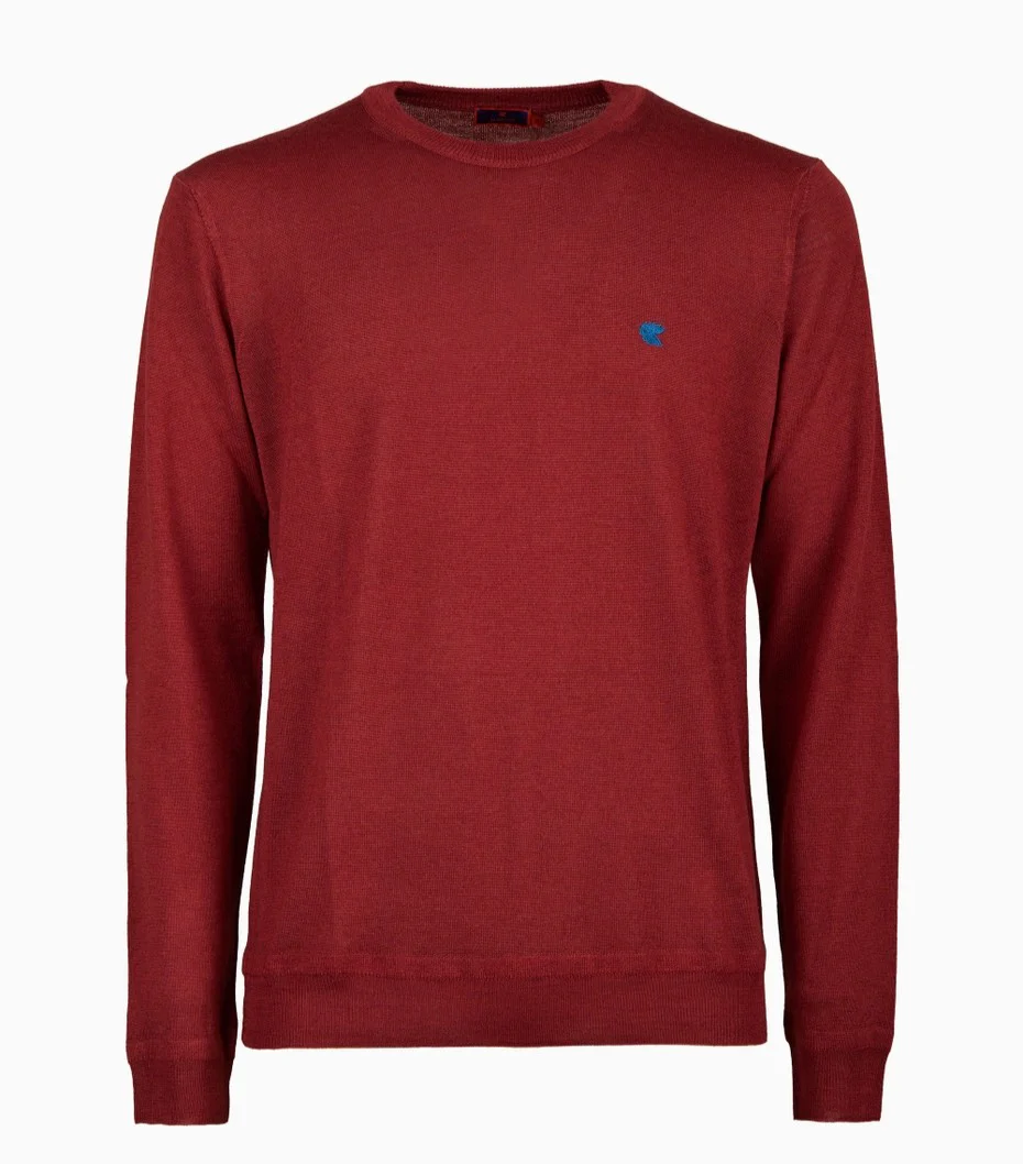 Pull girocollo da uomo realizzato in Italia. In lana, su fondo bordeaux con un piccolo logo sul davanti ricamato a contrasto.