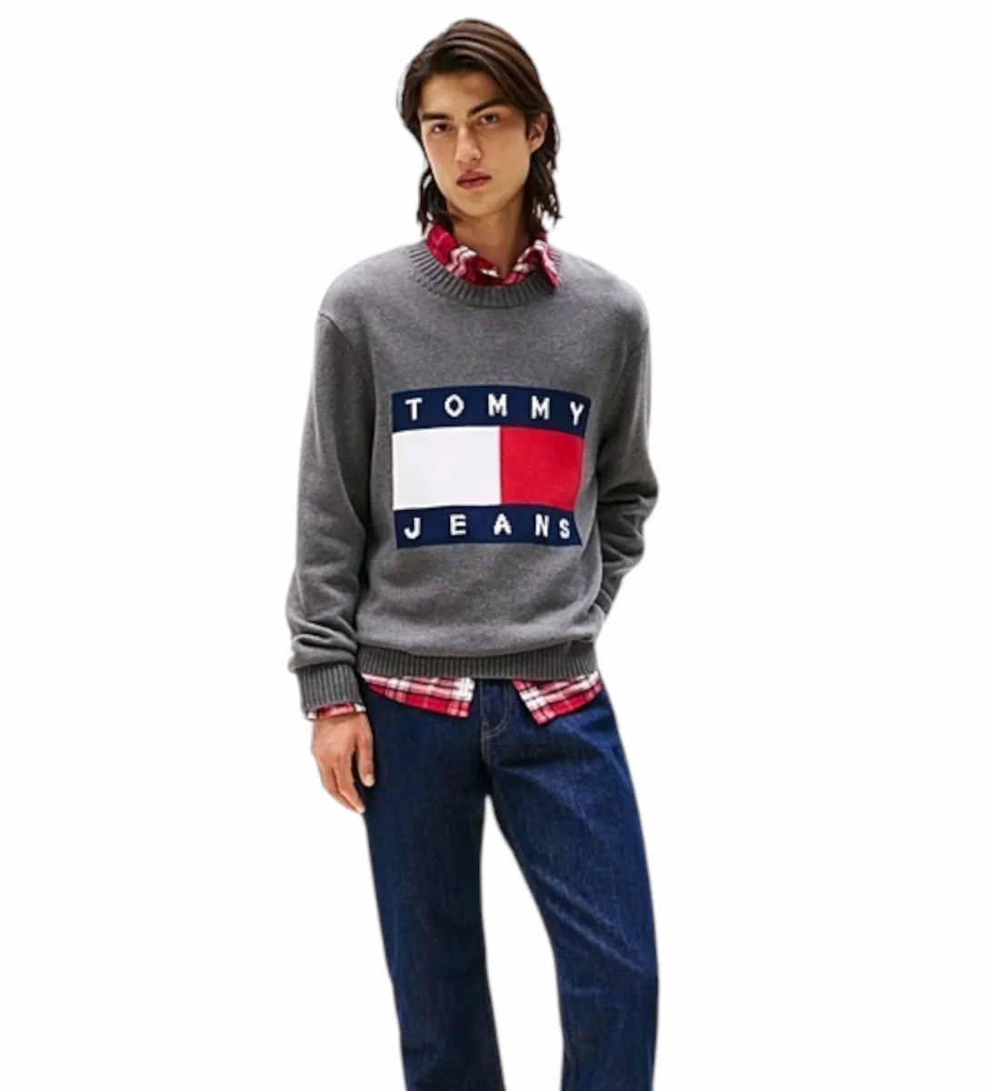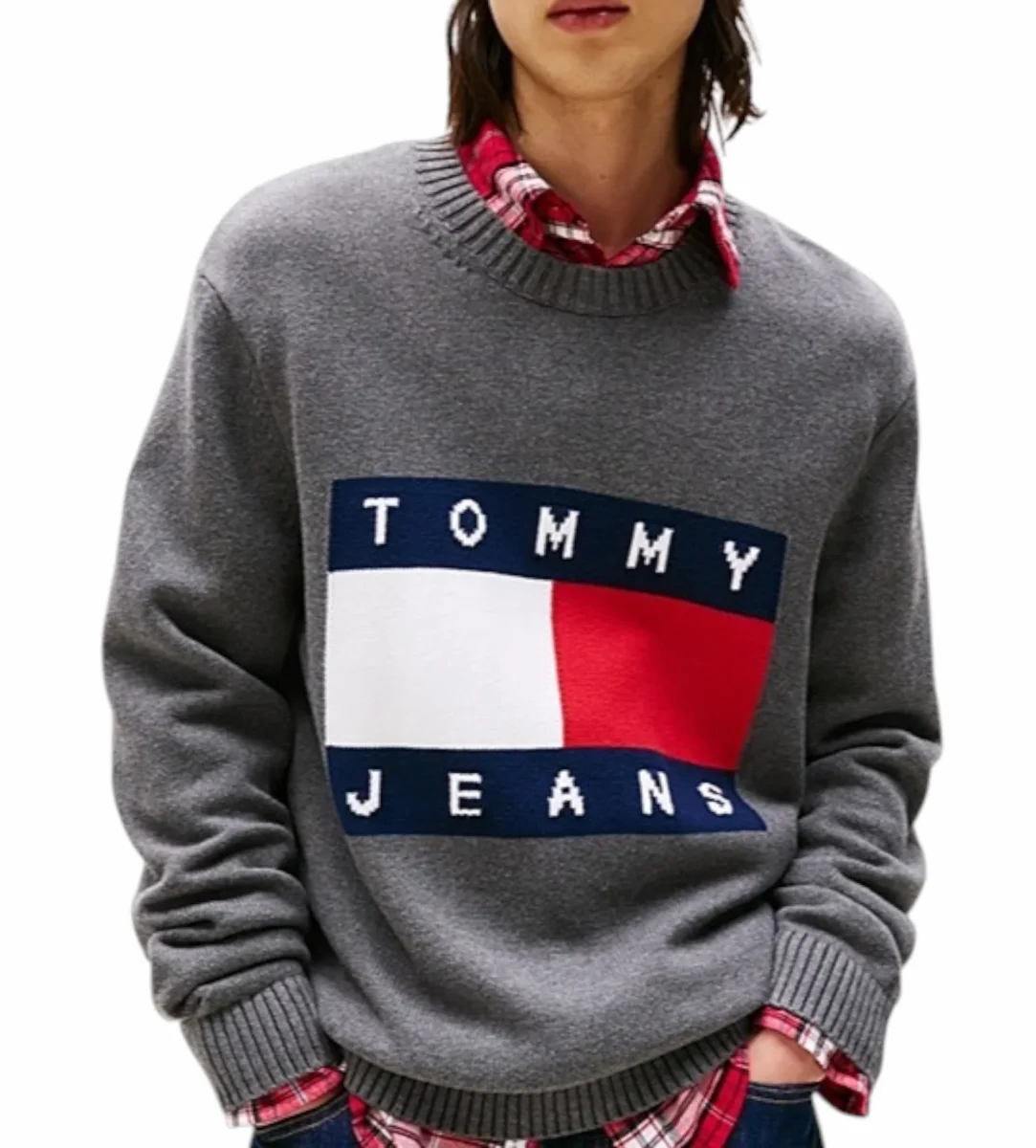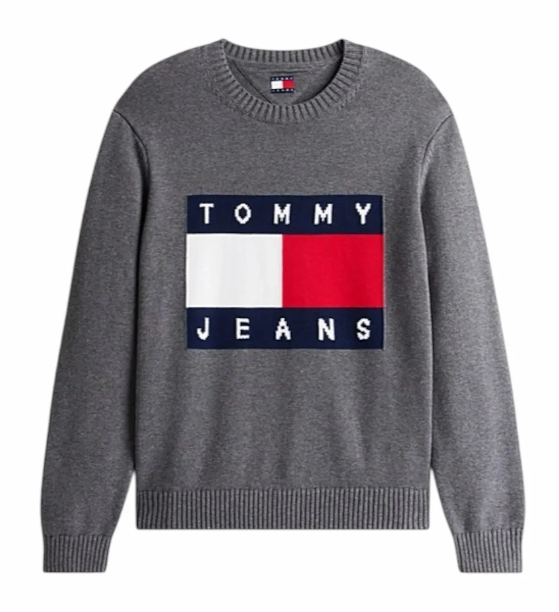 Pullover uomo grigio in puro cotone pettinato mรฉlange, girocollo, collo, polsini e fondo a coste, impreziosito dal branding a intarsio sul davanti. Vestibilitร regolare.