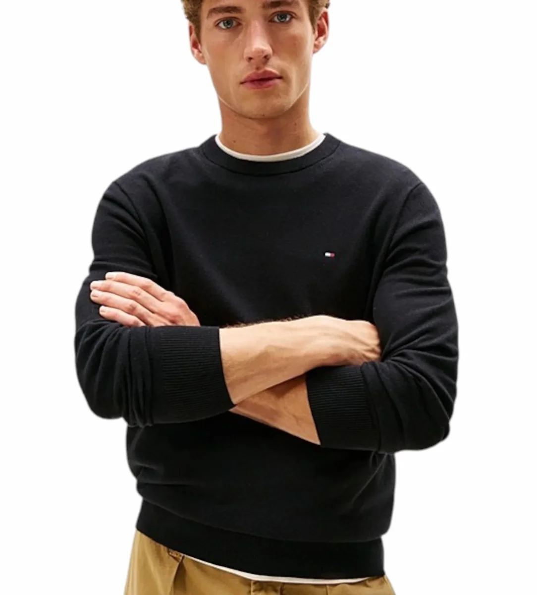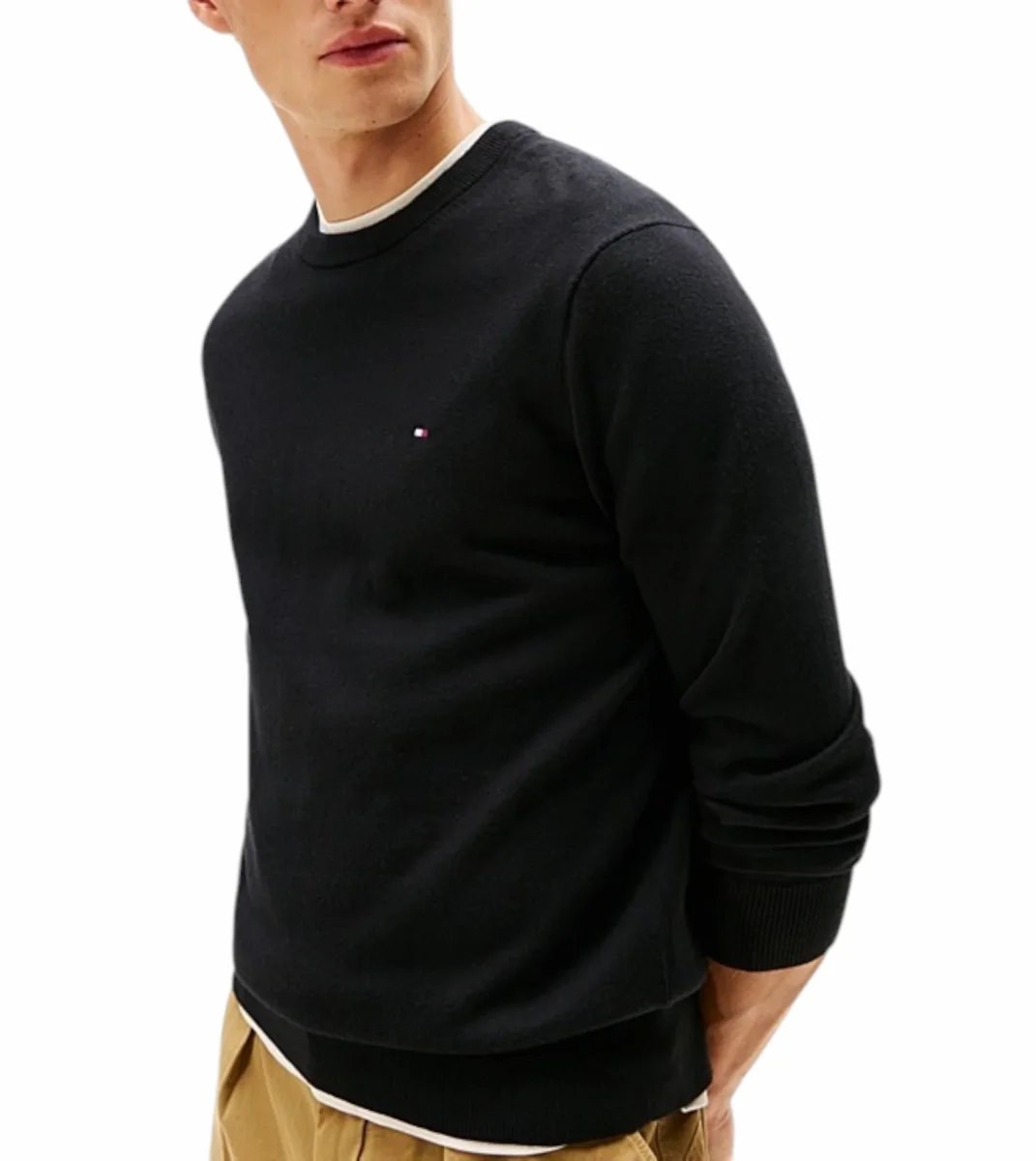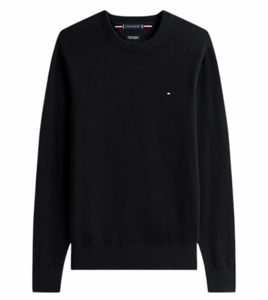 Pullover uomo nero a maniche lunghe, realizzato in lussuoso tessuto misto di cotone pima e cashmere, girocollo, collo, polsini e fondo a coste, nastro iconico all’interno del collo e bandierina Tommy Hilfiger ricamata sul petto. Vestibilitร regolare.