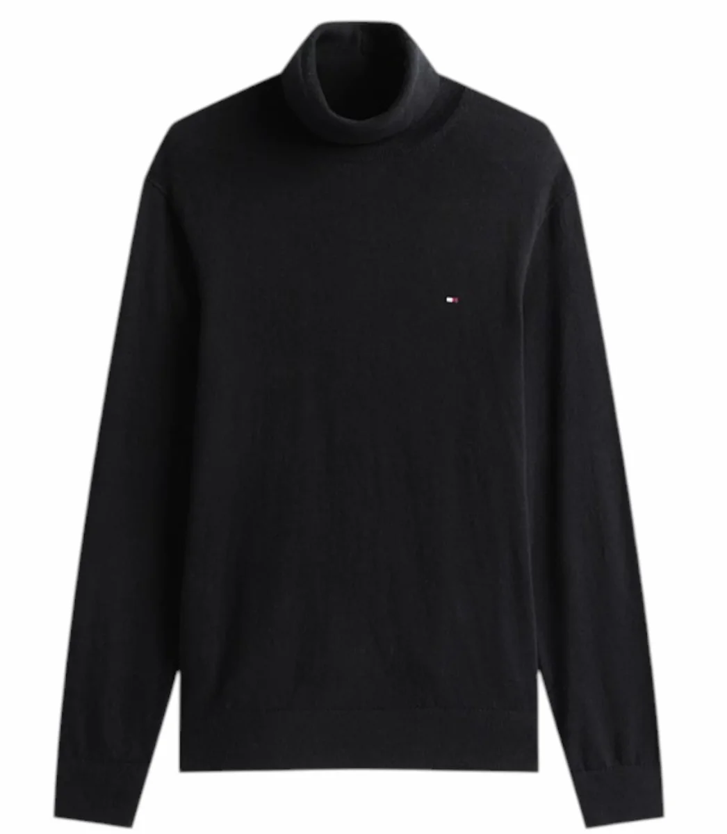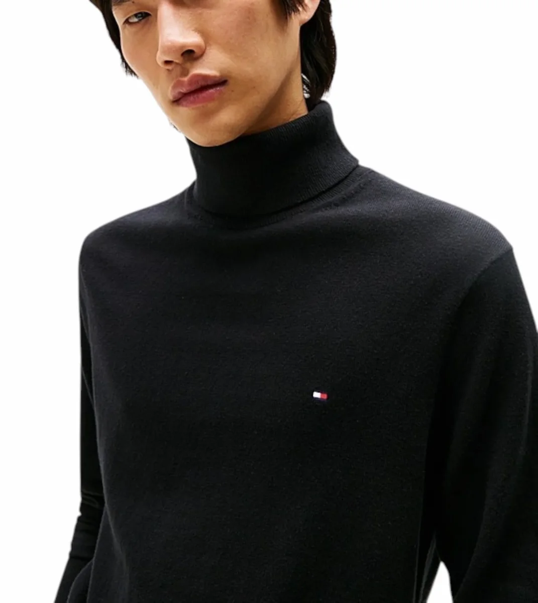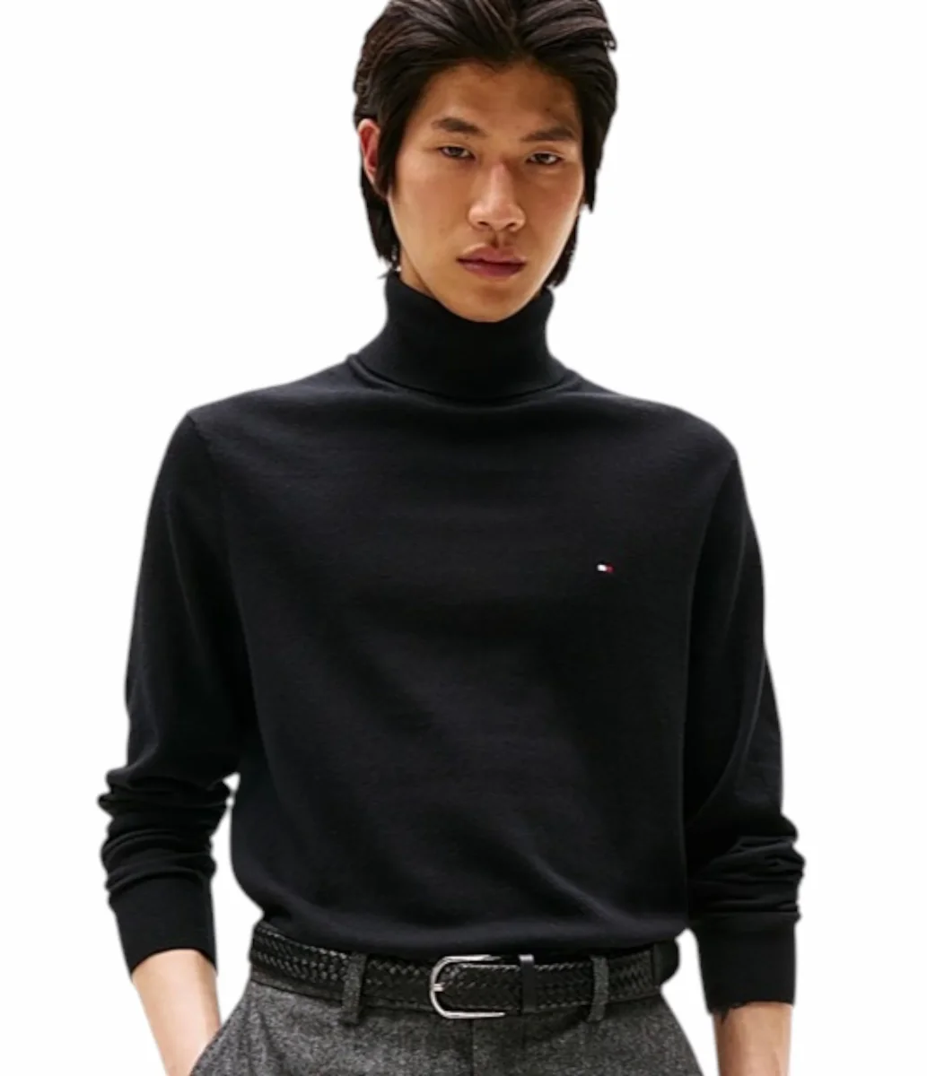 Pullover uomo nero in pregiato misto cotone pima e cashmere con collo dolcevita, collo, polsini e fondo a coste e bandierina ricamata sul petto รจ il capo ideale per i look smart casual. Vestibilitร regolare.