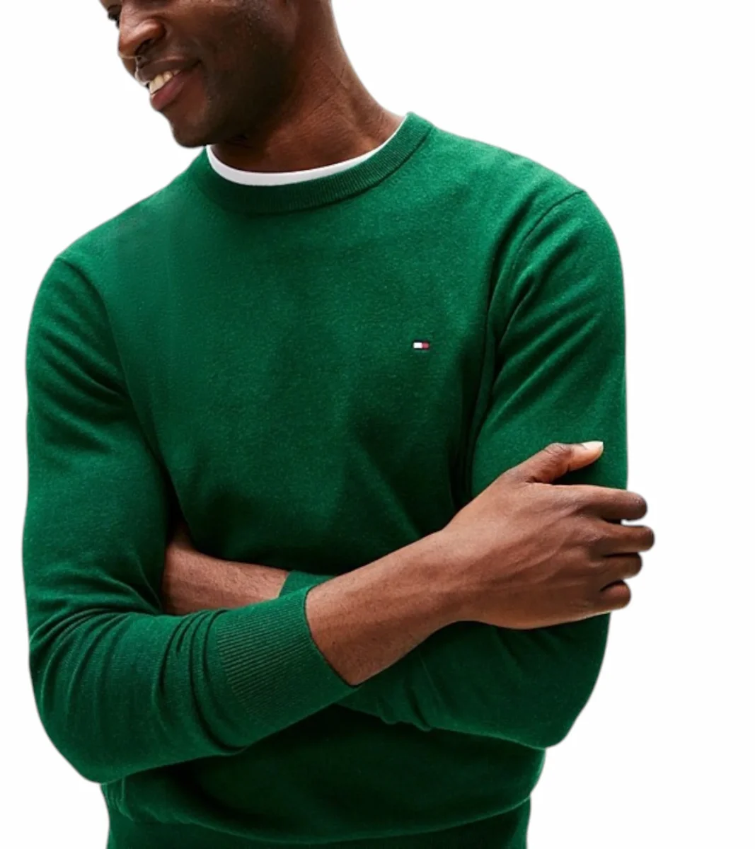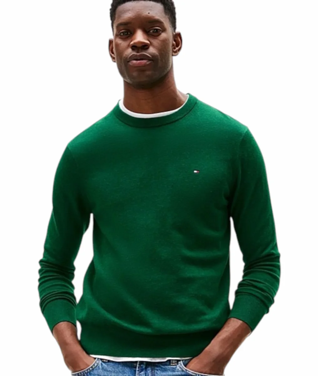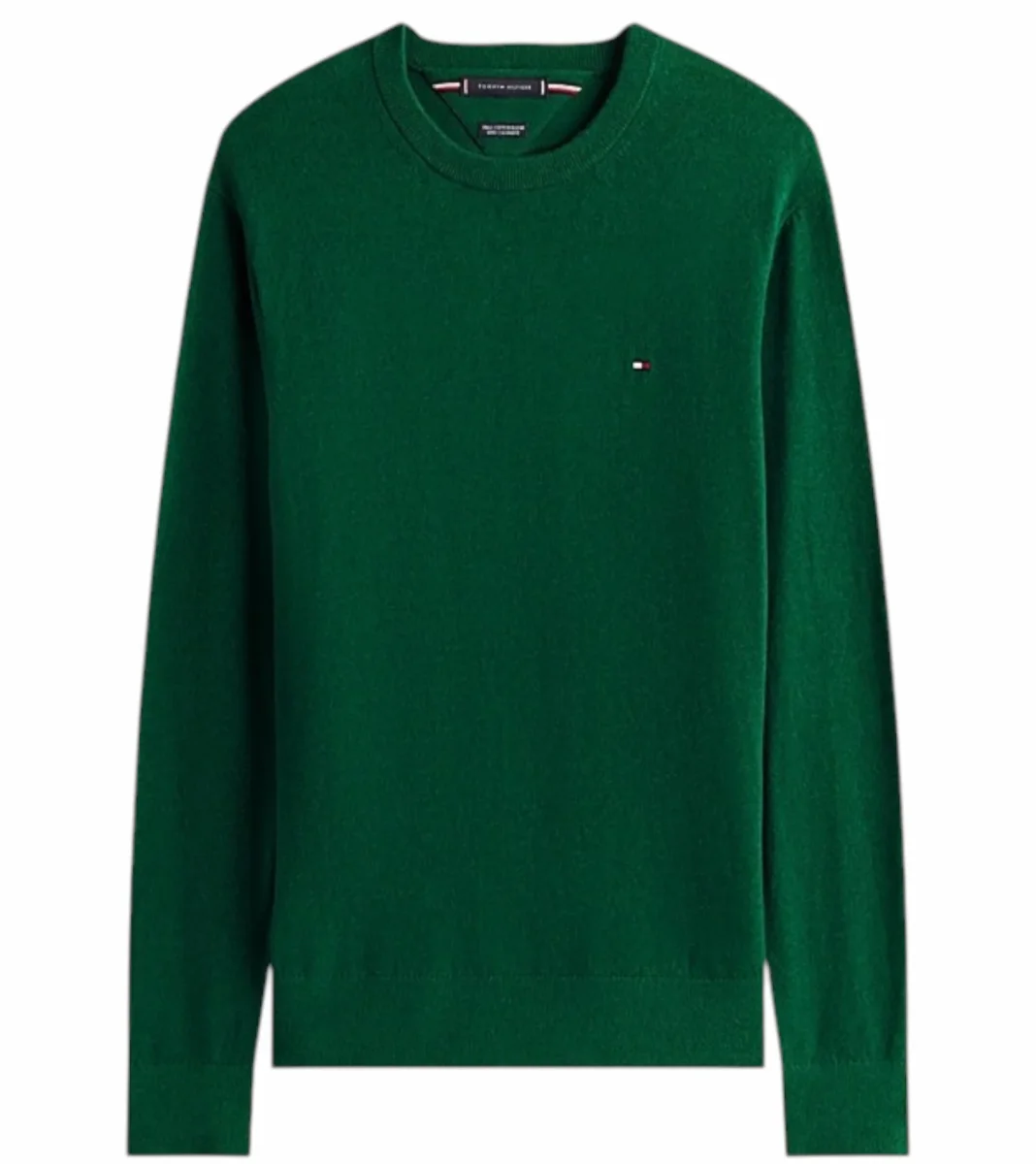 Pullover uomo verde a maniche lunghe, realizzato in lussuoso tessuto misto di cotone pima e cashmere, girocollo, collo, polsini e fondo a coste, nastro iconico all’interno del collo e bandierina Tommy Hilfiger ricamata sul petto. Vestibilitร regolare.