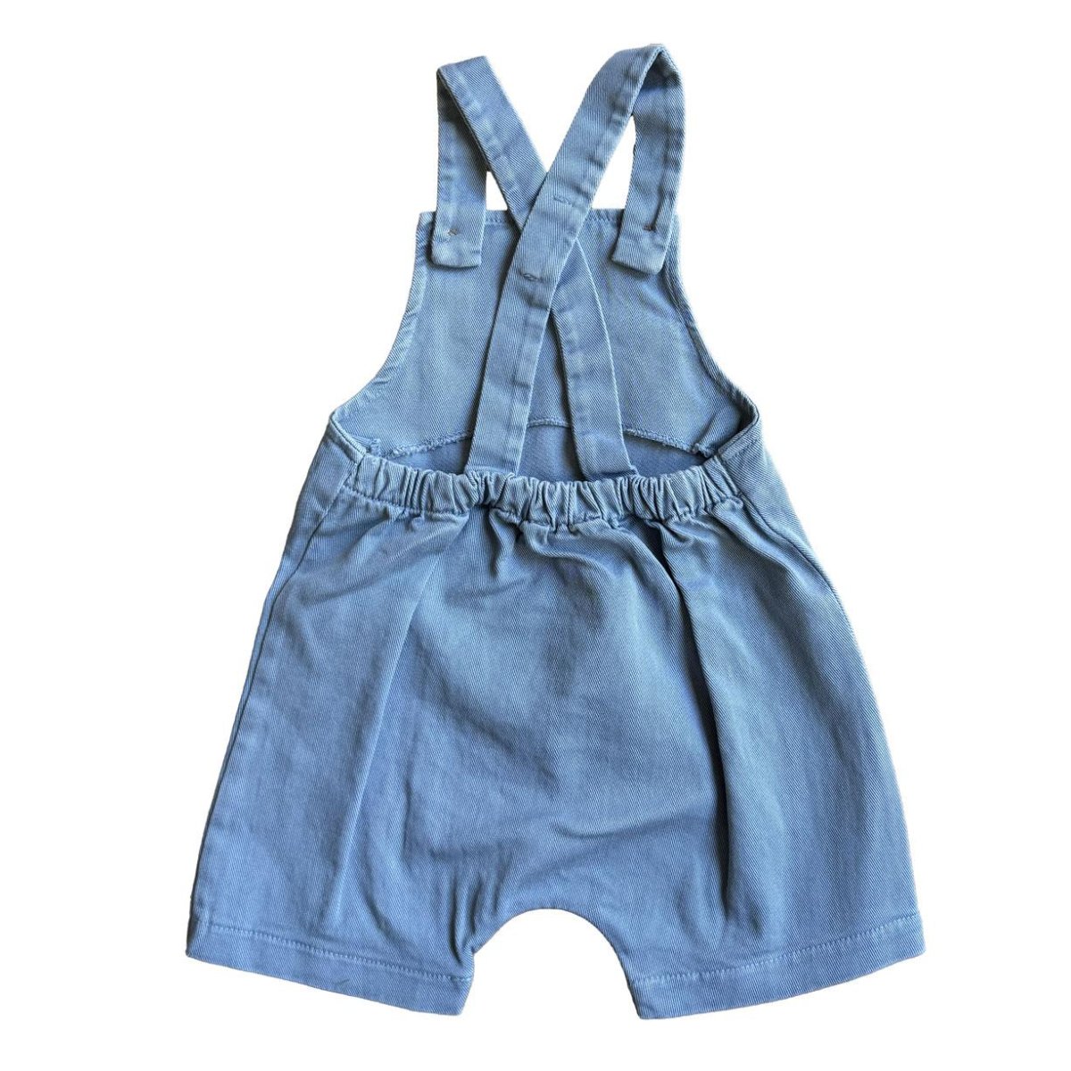 Salopette in denim, bottoncini in legno decorativi, elastico sulla schiena e maxi tasca sul fronte.