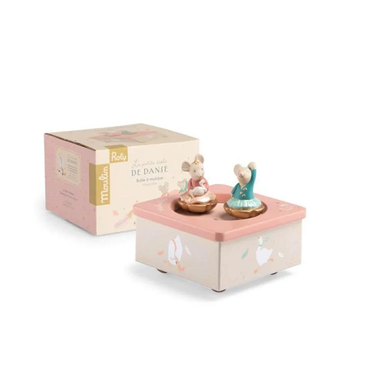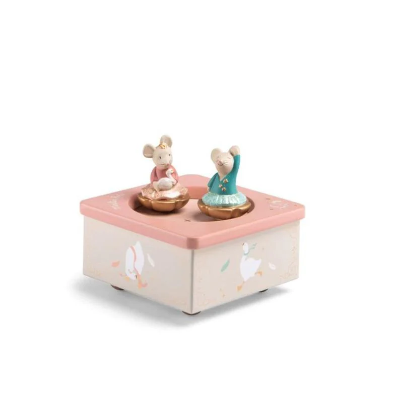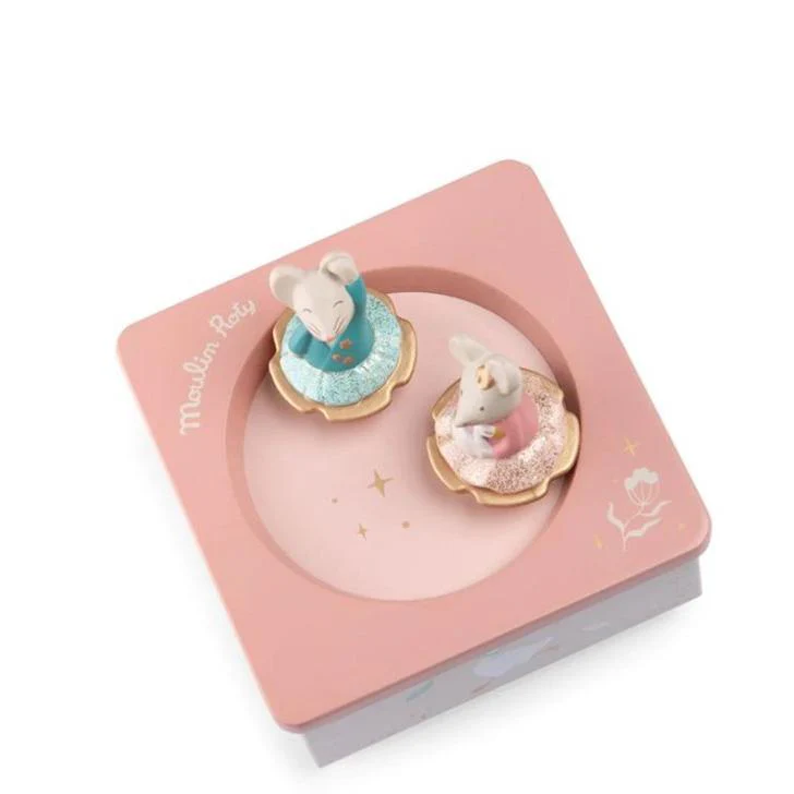 Scatola musicale illustrata dove 2 piccoli topi ballano al suono di una dolce melodia per cullare e addormentare il bambino. I piรน grandi si divertiranno ad azionare da soli il meccanismo sotto la scatola per vedere ballare le figurine di resina.