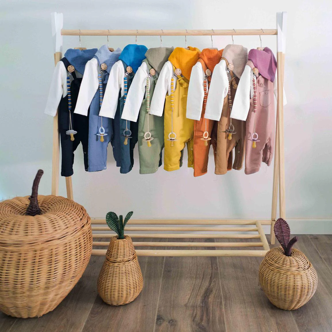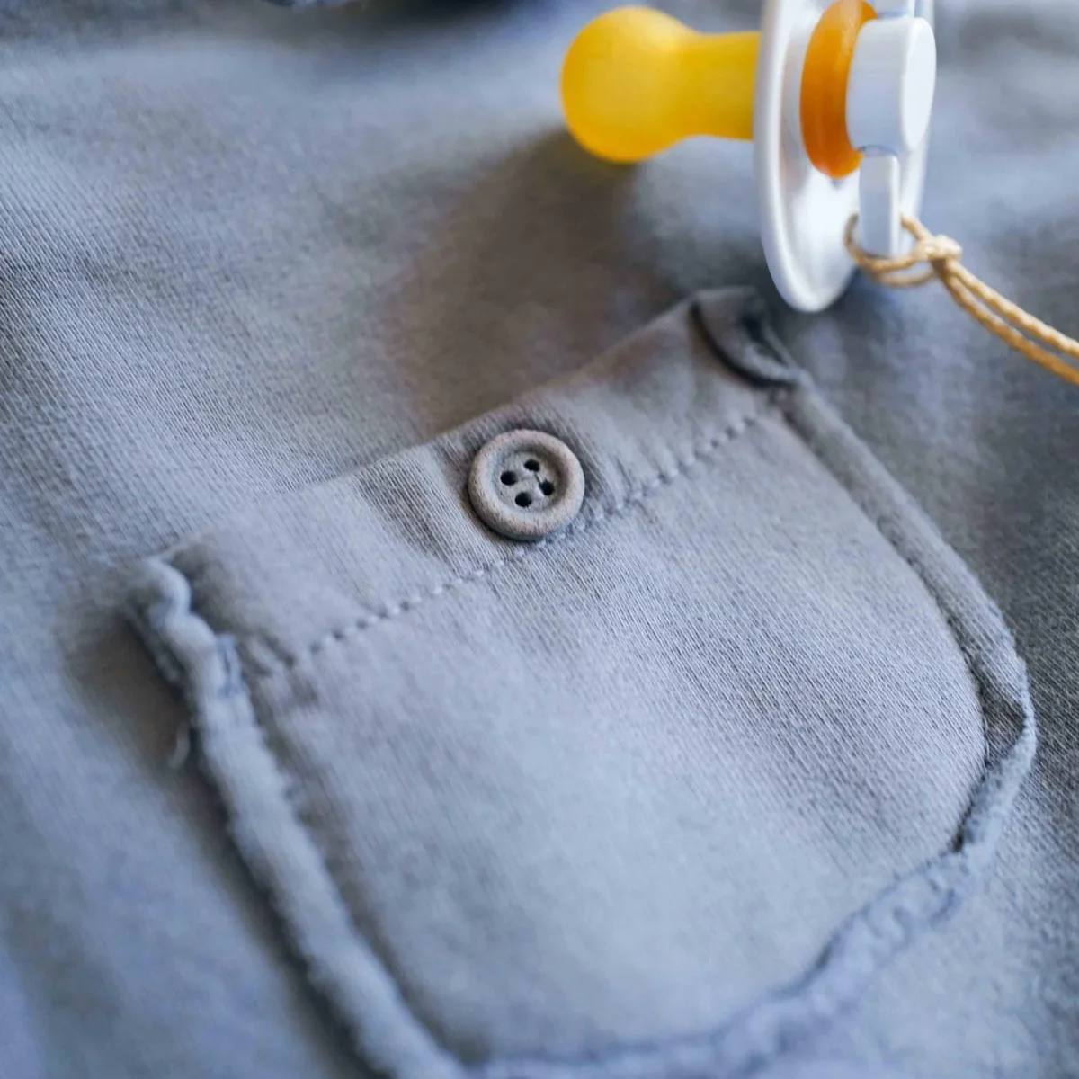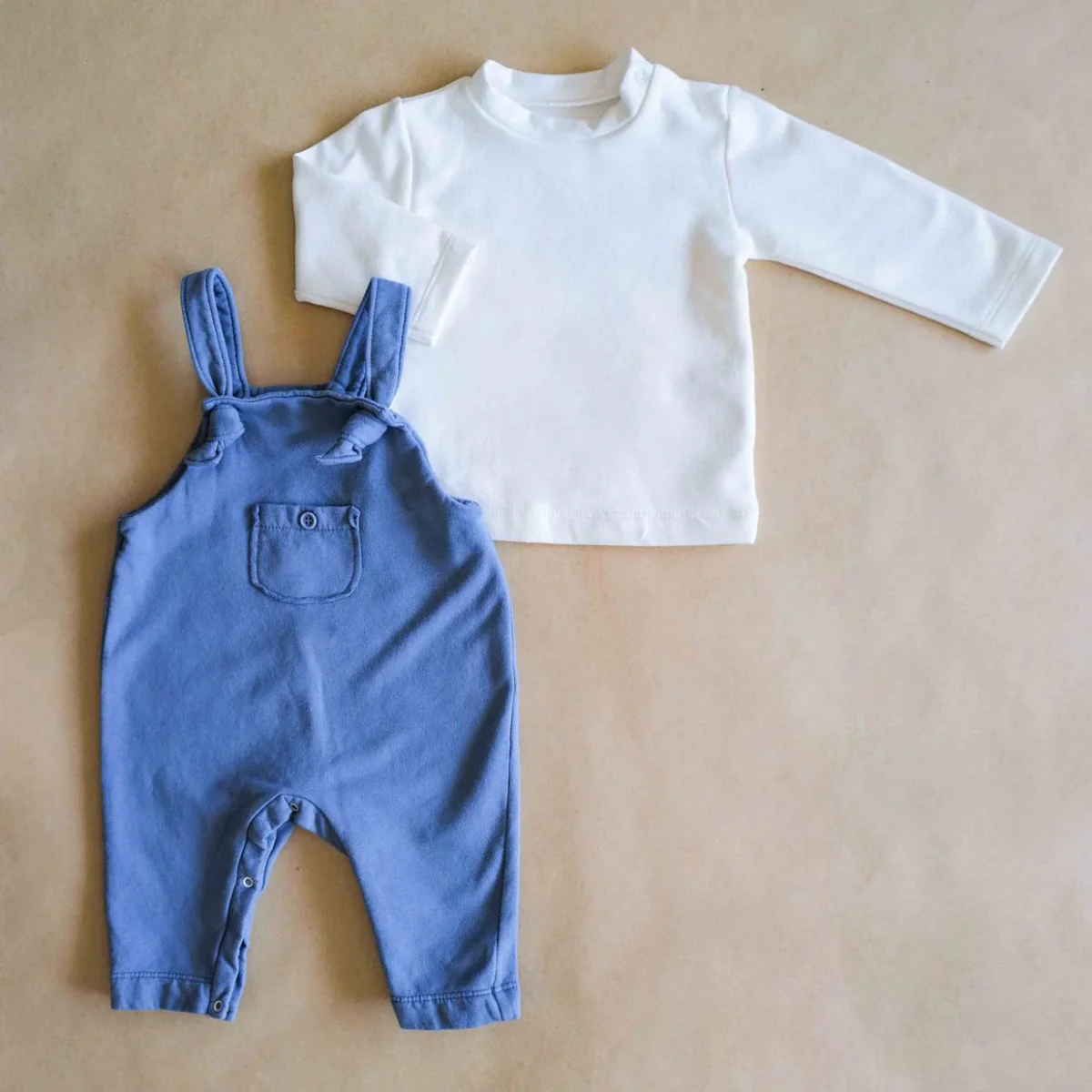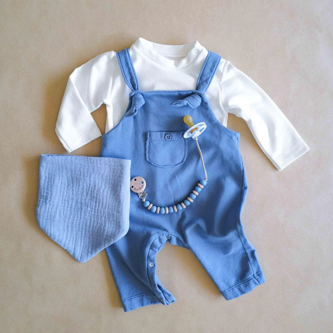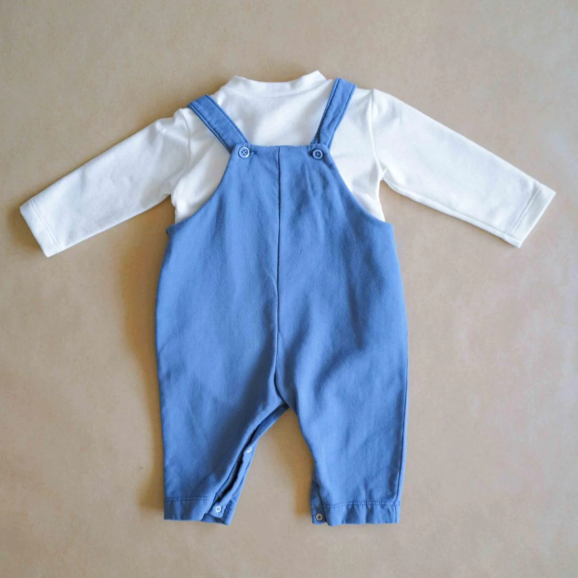 Set salopette con taschina applicata sul fronte, apertura sul cavallo tramite bottoncini automatici, chiusura bretelle con bottone e nodo.