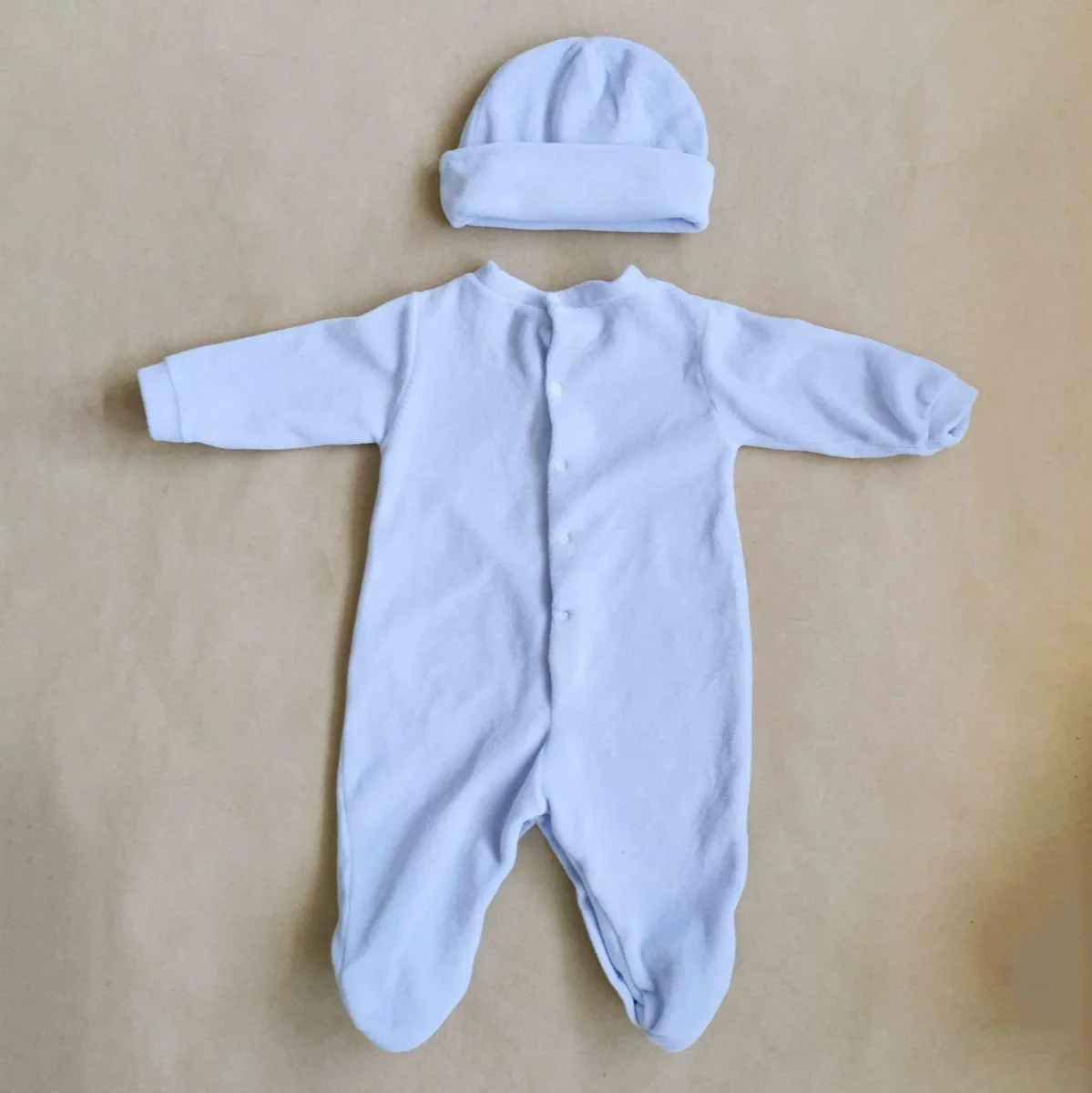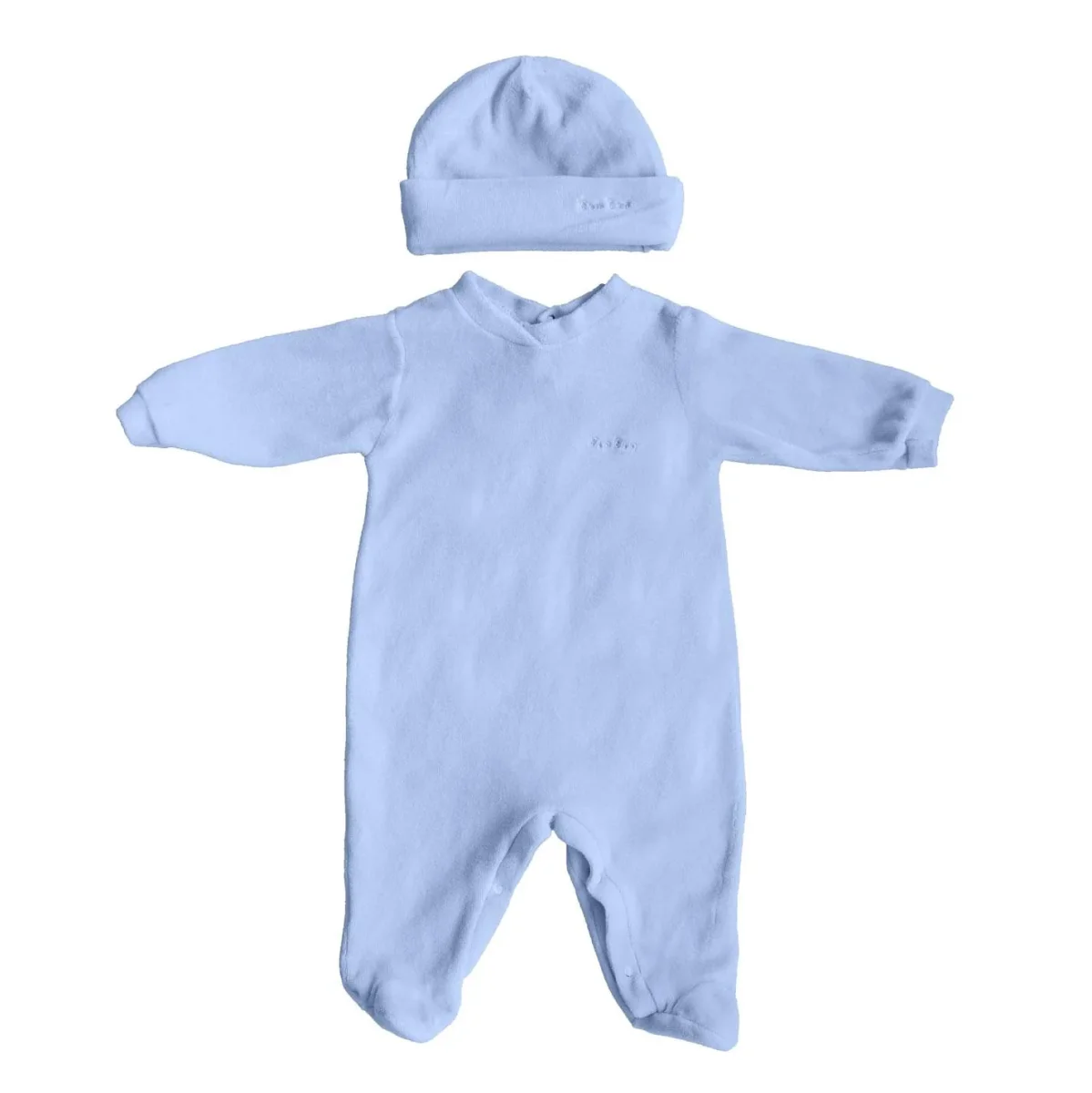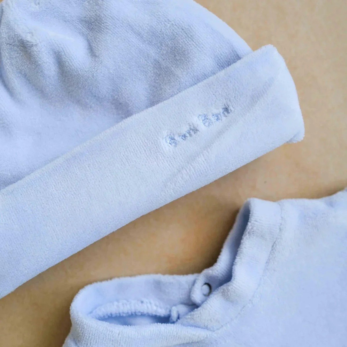 Set tutina e cappello, bottoncini a pressione sul cavallo e sul retro. Dettaglio con ricamo Bon Bon.
