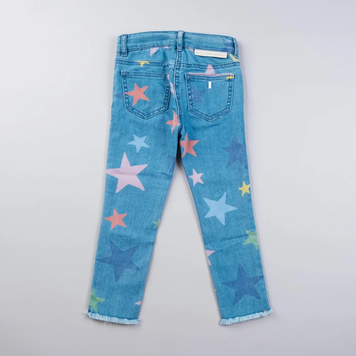 Jeans in denim con stampa stelle all over. Composizione: 67% cotone organico, 31% poliestere riciclato, 2% elastan