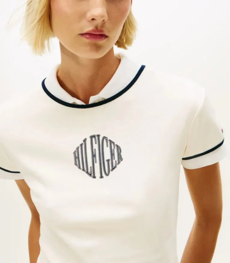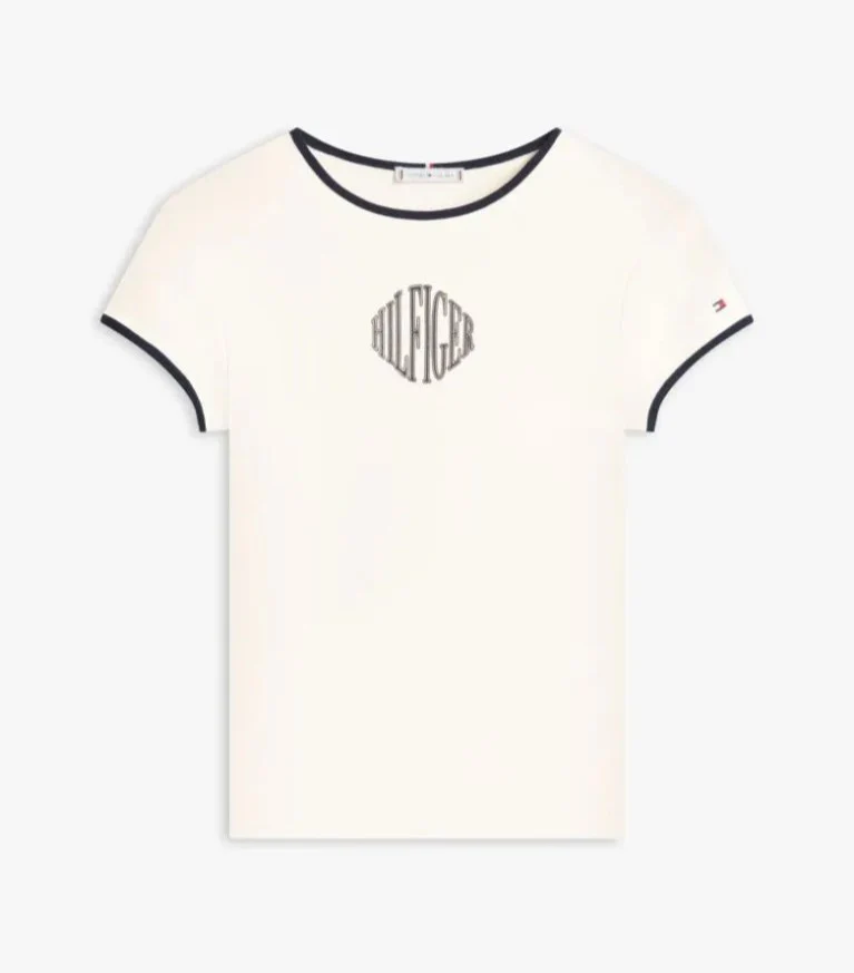 T-ahirt donna avorio realizzata in puro cotone con finitura setosa, modello dallo stile retrรฒ e dalla vestibilitร slim, con scollo e polsini a contrasto di colore, logo sul petto.