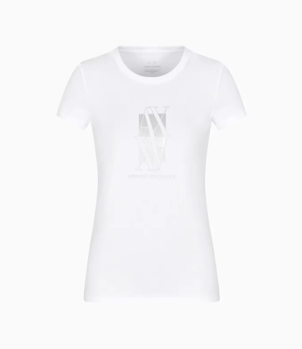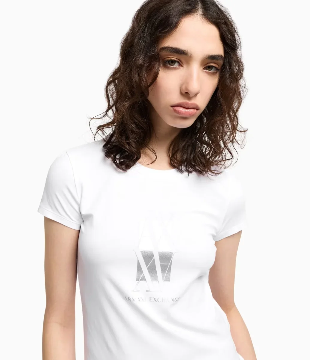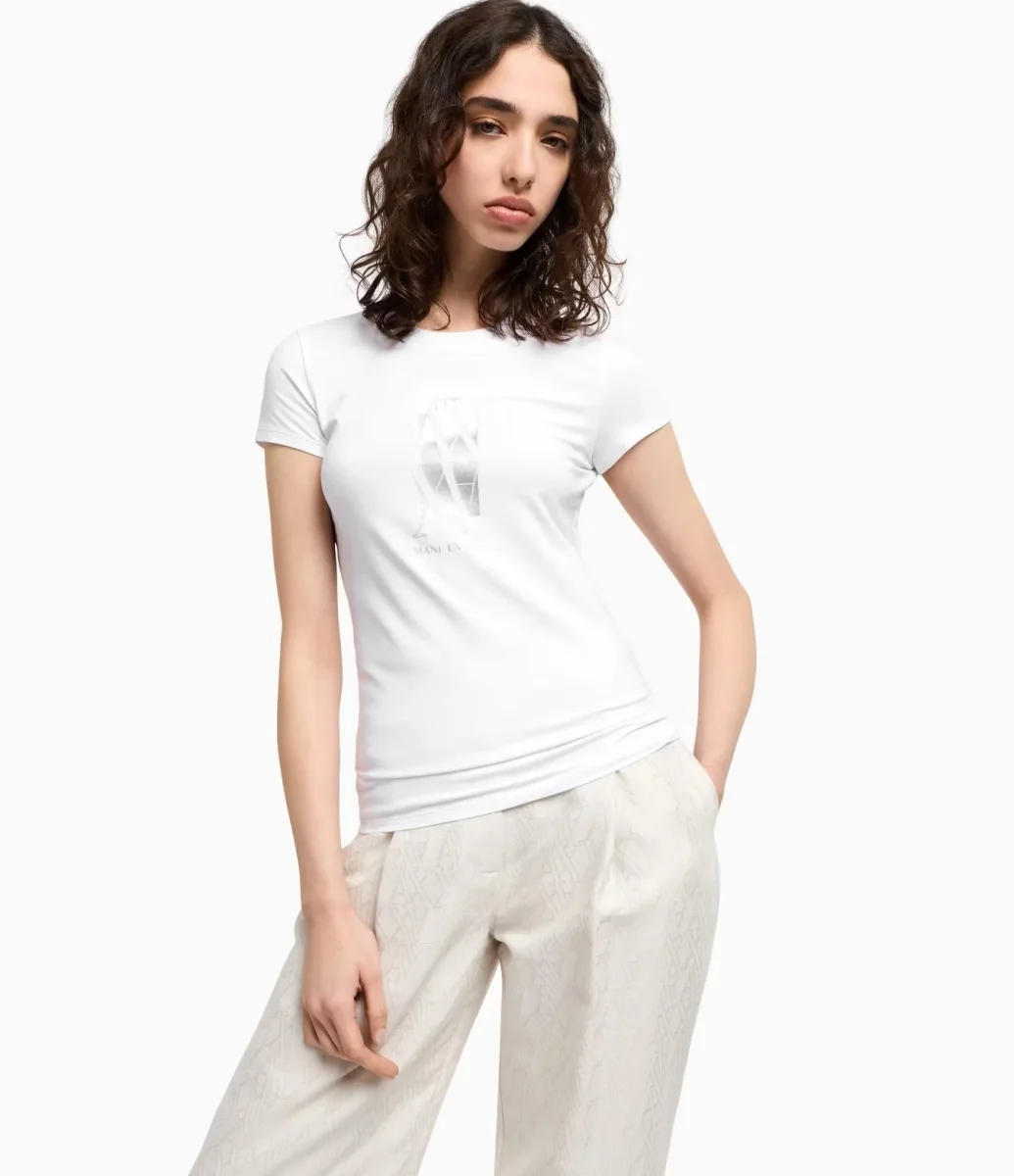 T-shirt donna bianca in jersey elasticizzato dalla vestibilitร slim, perfetta per valorizzare la silhouette senza rinunciare al comfort. Il logo stampato sul petto aggiunge un tocco distintivo, mentre lo scollo rotondo e le maniche corte completano un design essenziale e versatile.