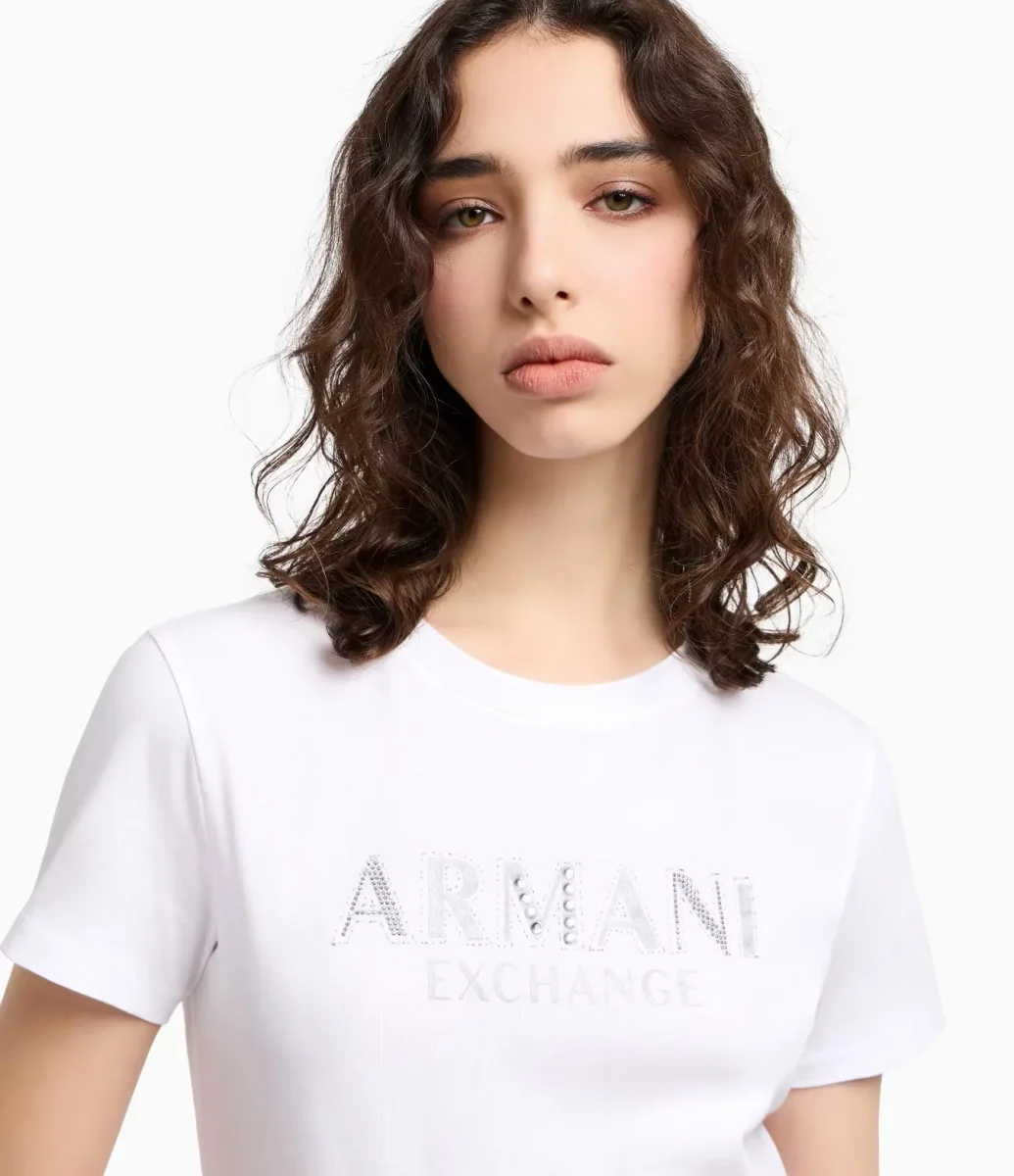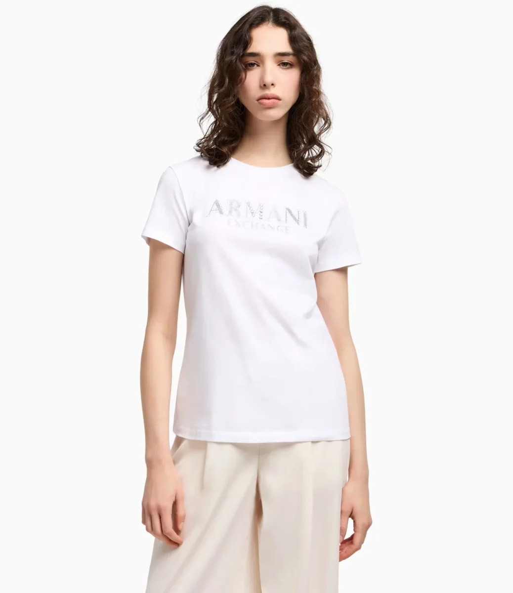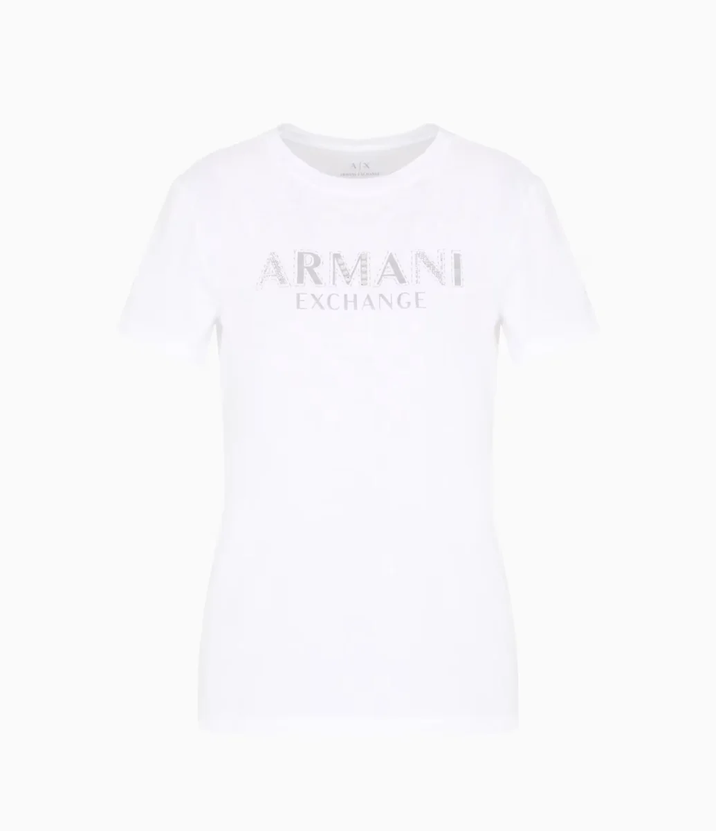 T-shirt donna bianca dalla vestibilitร regolare, realizzata in morbido jersey di cotone, presenta una stampa con logo effetto metallo, che aggiunge un tocco di eleganza al design semplice. Lo scollo rotondo e le maniche corte la rendono perfetta per un look casual e di tendenza.