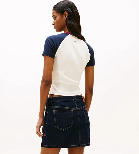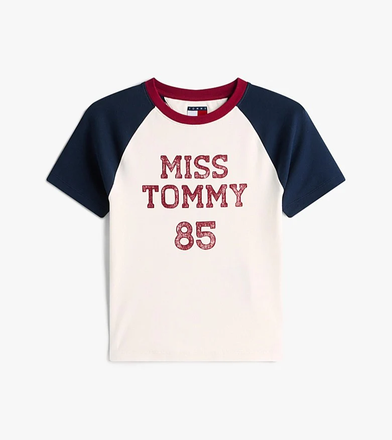T-shirt donna in cotone stretch bianca con maniche reglan a contrasto, con logo sbiadito sull petto, in stile college. Vestibilitร slim.