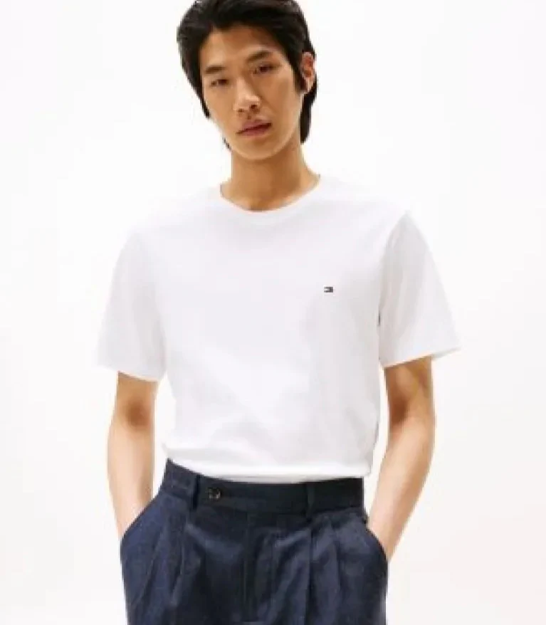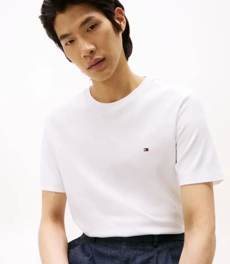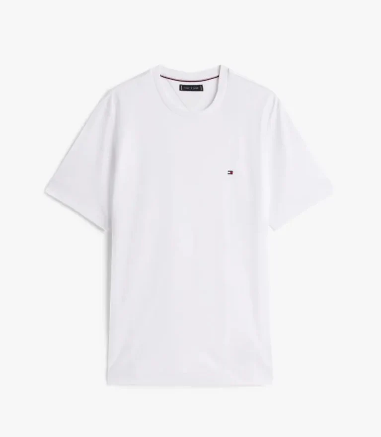 T-shirt uomo bianca in puro cotone a maglia interlock, modello girocollo a coste, dalla vestibilitร regolare con bandierina ricamata sul petto.