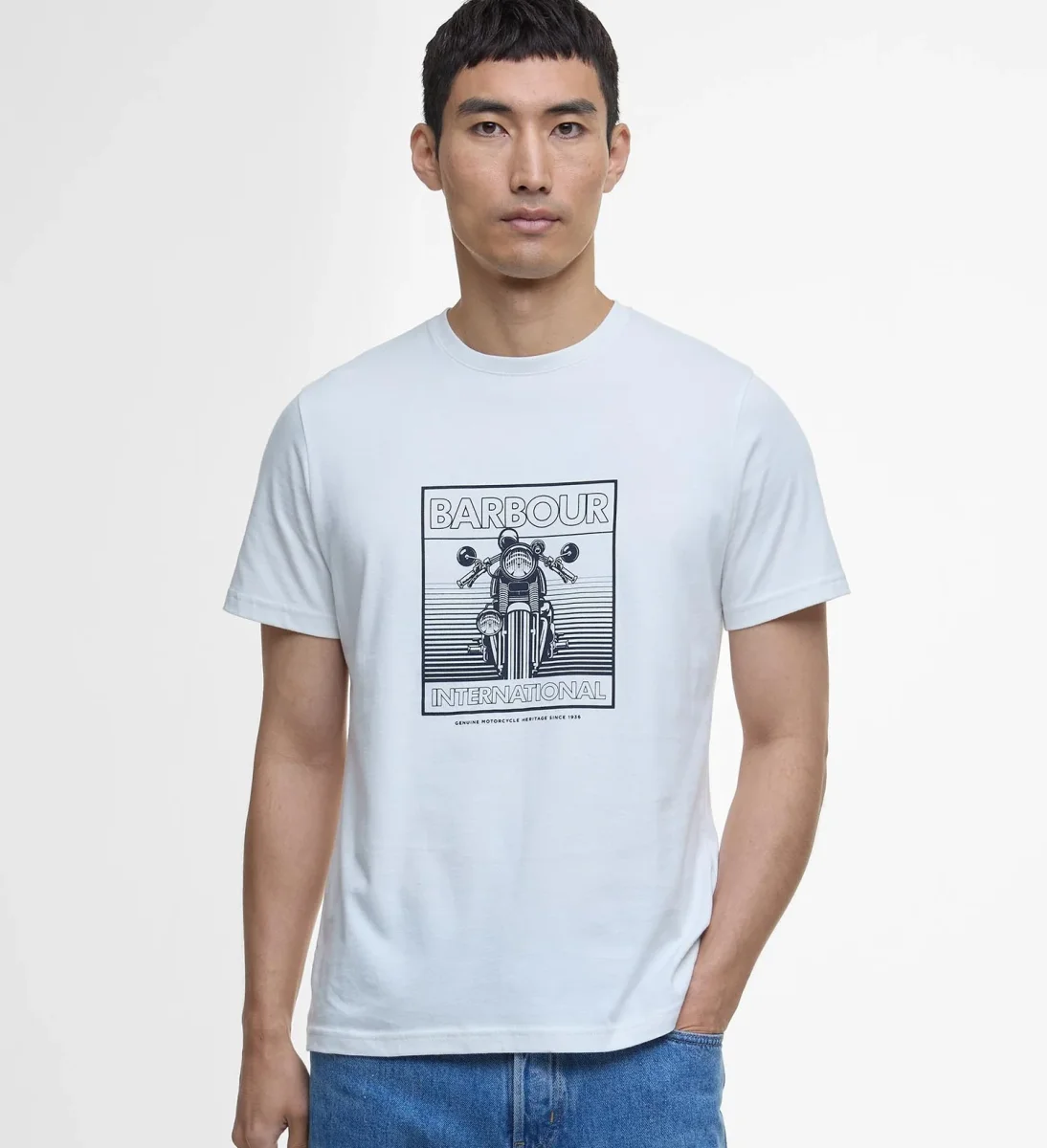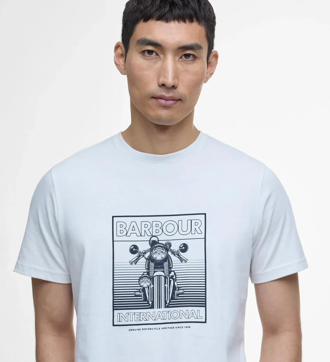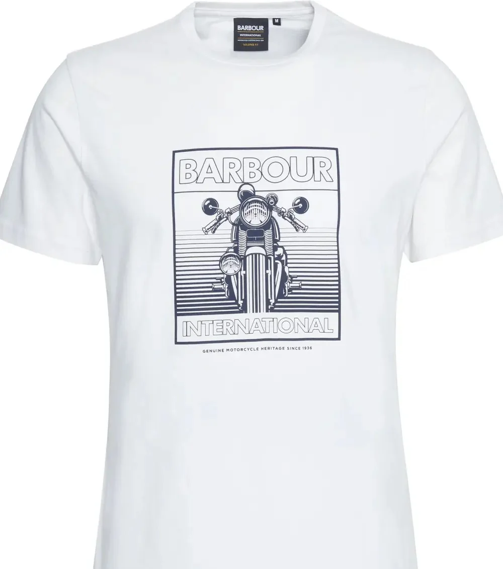 T-Shirt uomo bianca in cotone. La t-shirt Track รจ caratterizzata da unโaudace stampa raffigurante una motocicletta sul petto. Disponibile nelle taglie dalla S alla XL.