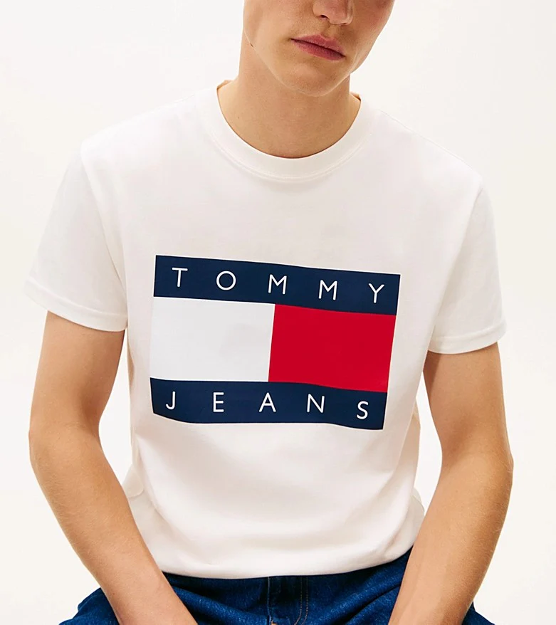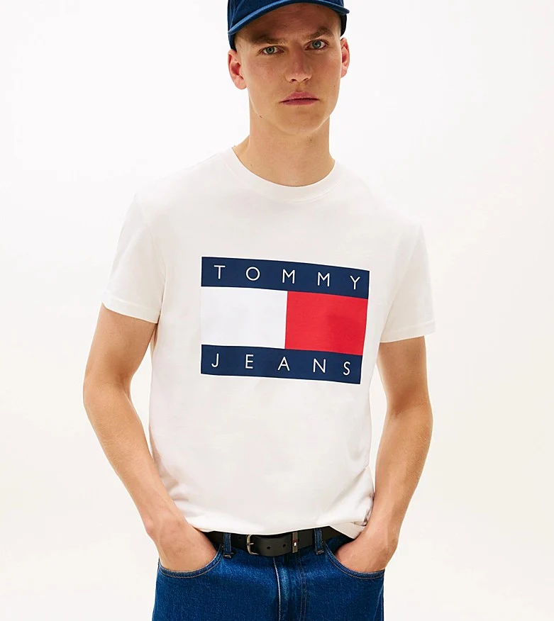 T-shirt uomo bianca in jersey di puro cotone, modello girocollo dalla vestibiltร regolare con bandiera grande stampata sul petto.