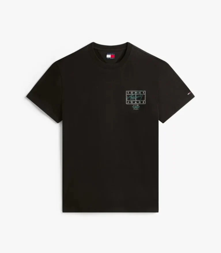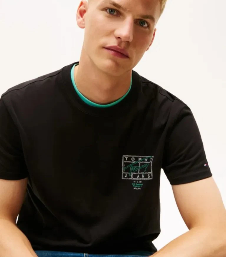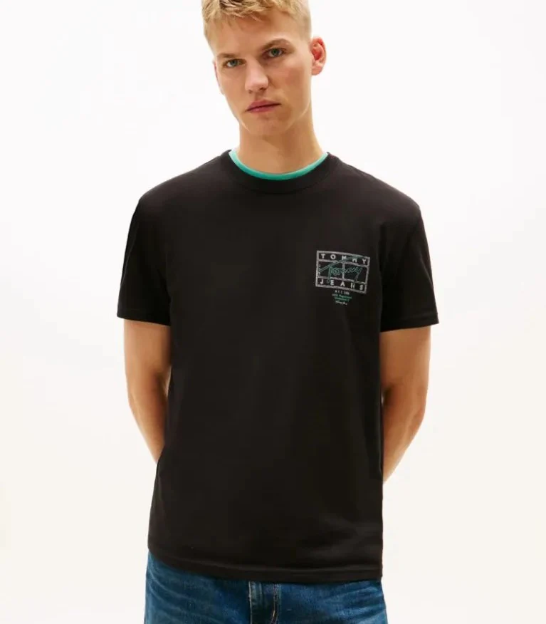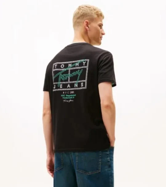 T-shirt uomo nera in jersey di puro cotone, modello girocollo dalla vestibilitร regolare, con logo dallo stile un po’ street-art dato dal design effetto spray sulla schiena e sul petto.