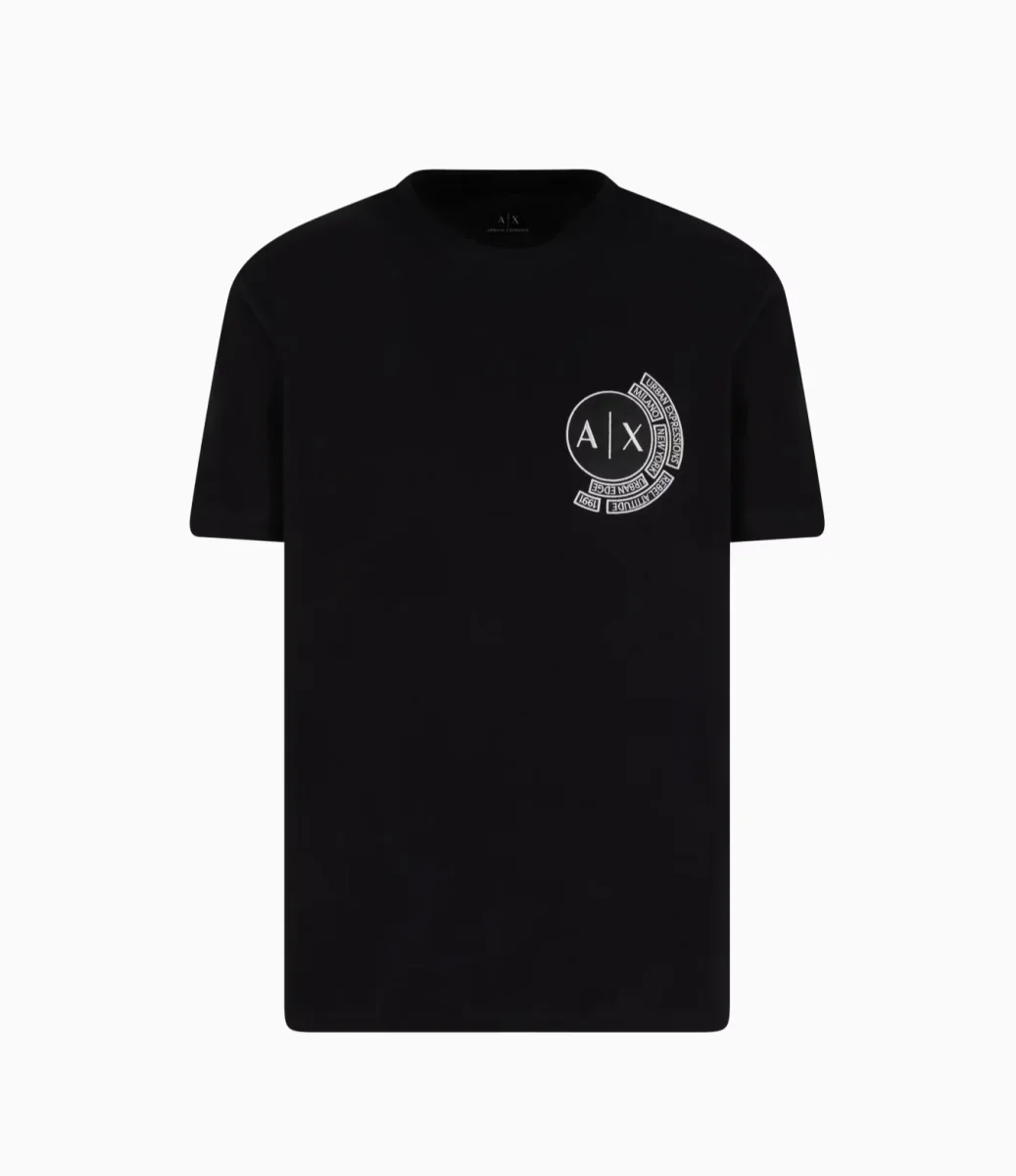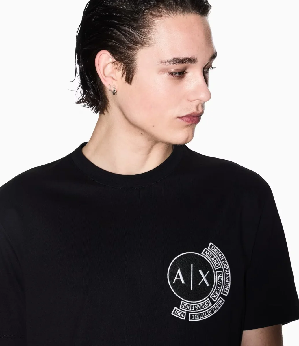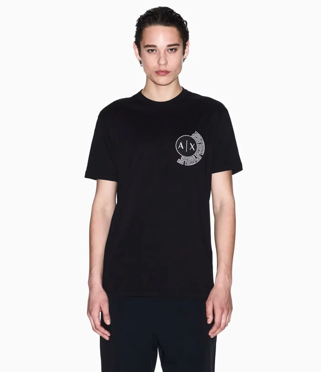 T-shirt uomo in jersey di cotone nero dalla vestibilitร regolare che offre comfort e versatilitร . Lo scollo rotondo e le maniche corte assicurano una vestibilitร classica, mentre il logo sul petto aggiunge un tocco distintivo.