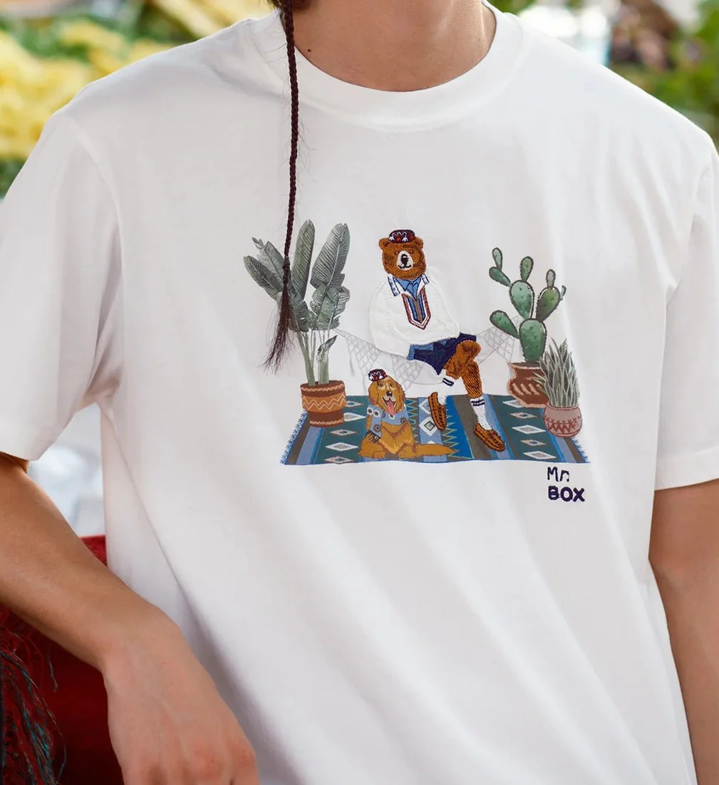 T-shirt uomo in cotone bianco con ricamo sul petto che raffigura un orsetto elegante seduto su una sedia, affiancato da un cane e piante tropicali come cactus e banano. La grafica ricamata a colori vivaci crea una scena unica in stile โdesert chicโ, con firma Mr. Box ricamata in basso a destra. Modello a girocollo con maniche corte e vestibilitร regolare. Realizzata in cotone leggero e traspirante, ideale per la stagione primavera/estate.