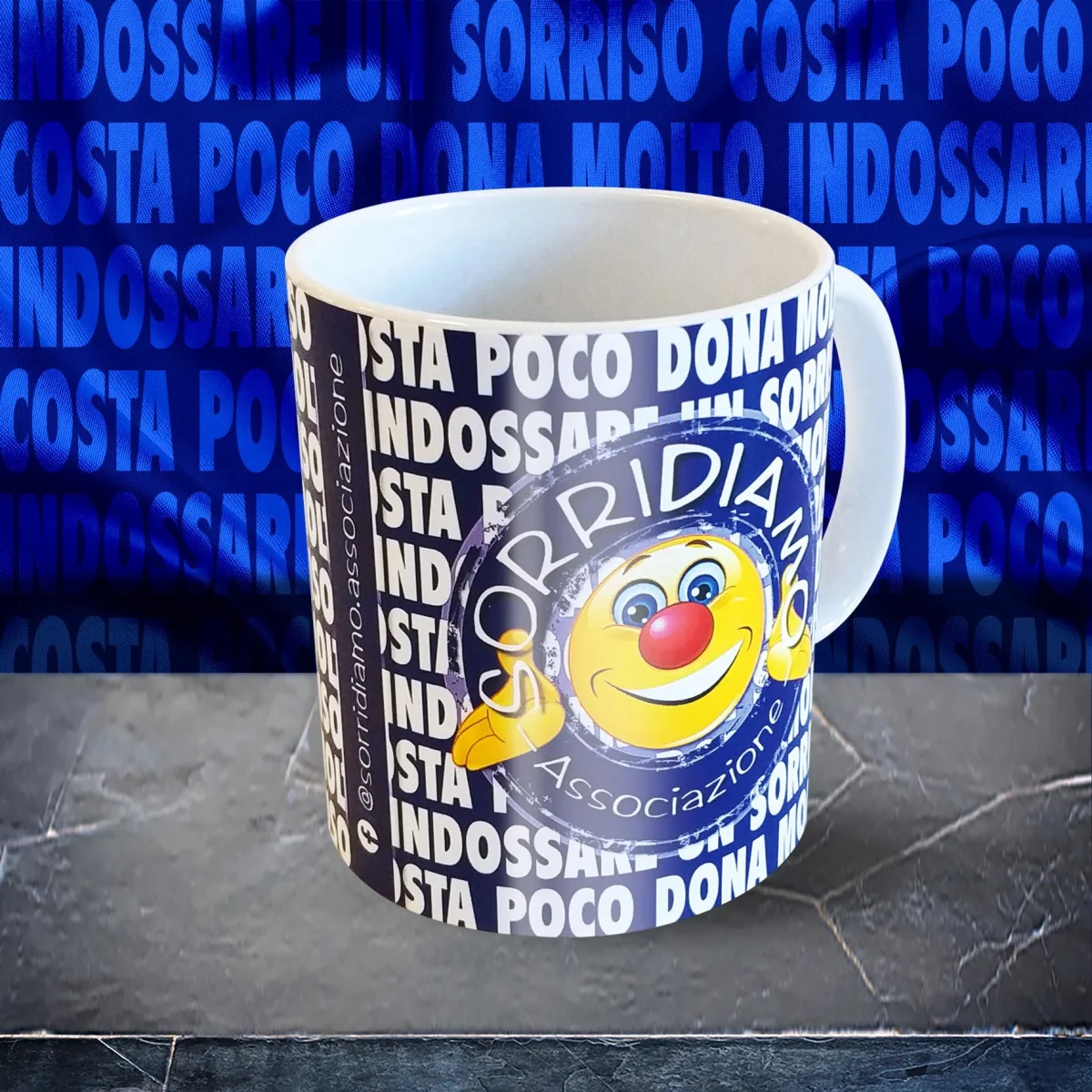 Tazza in ceramica personalizzata Sorridiamo Associazione. Materiale: ceramica di alta qualità Colore base: bianco Adatta a lavastoviglie e forno a microonde Solo per questo prodotto, spese di spedizione agevolate di 3,50 Euro.