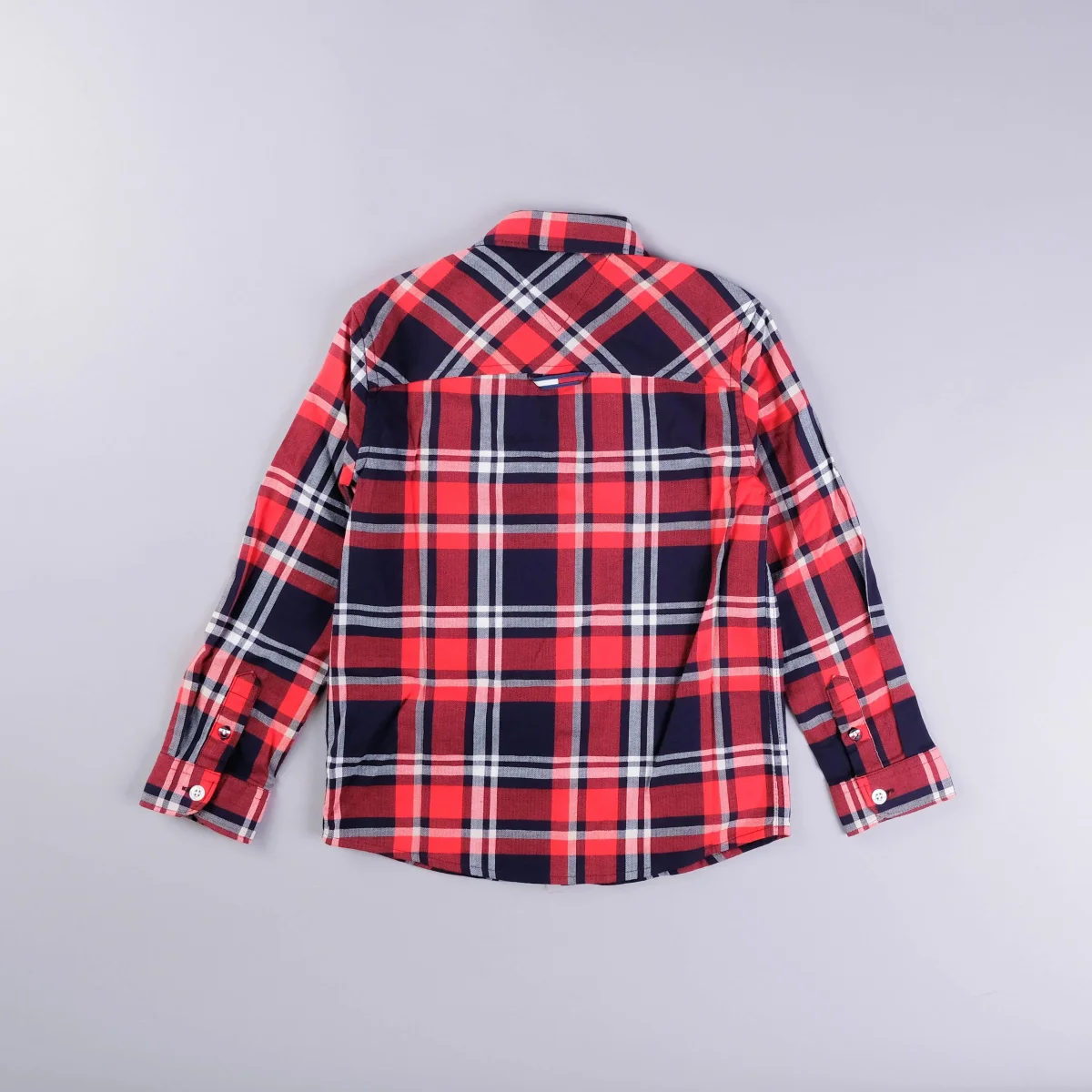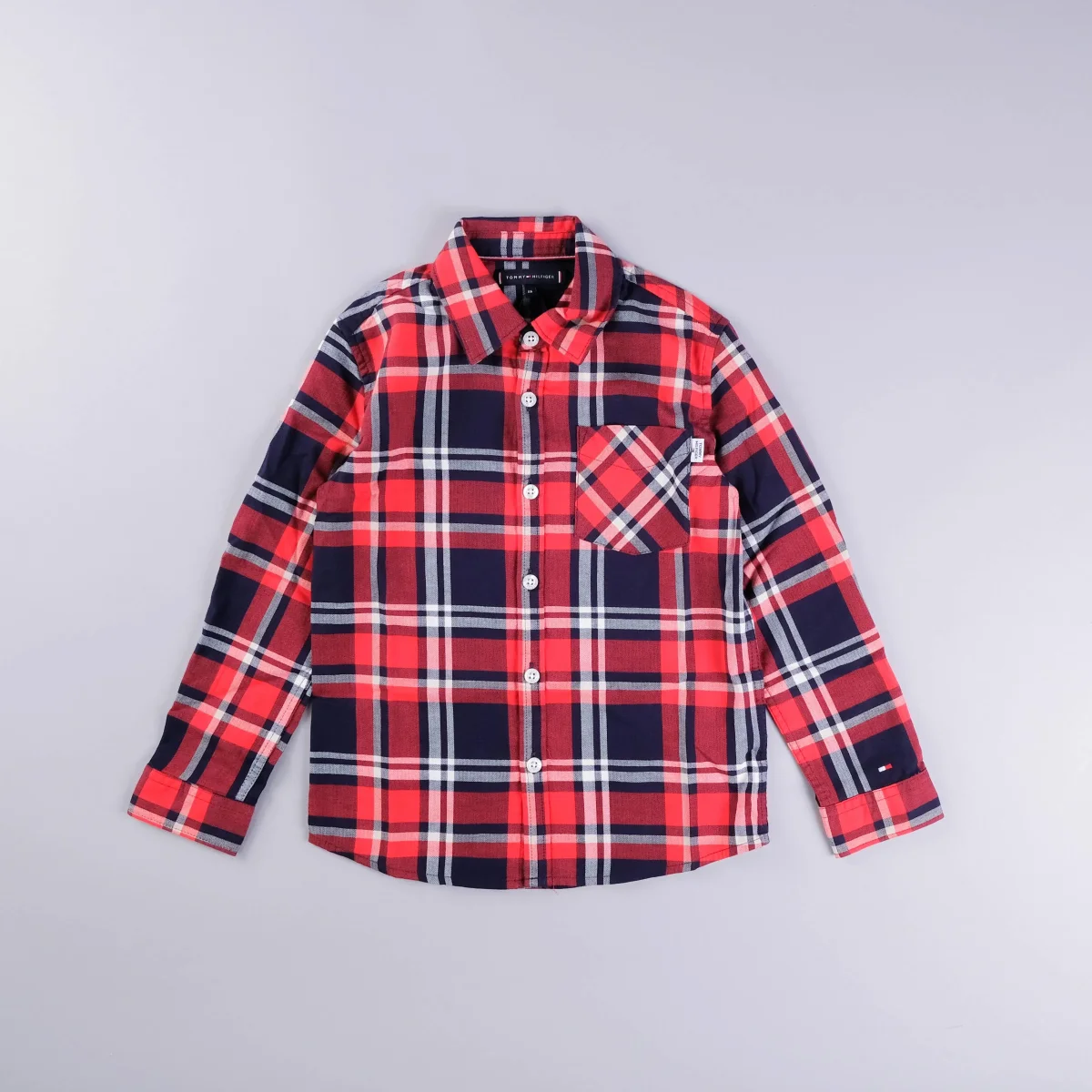 Camicia in chambray di cotone a quadri, colletto semifrancese, tasca applicata sul petto.