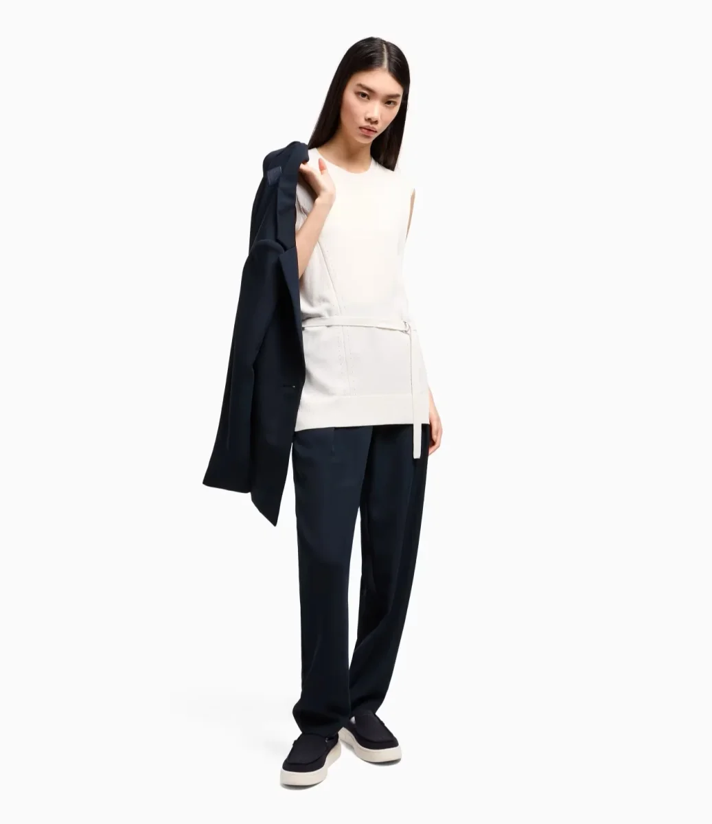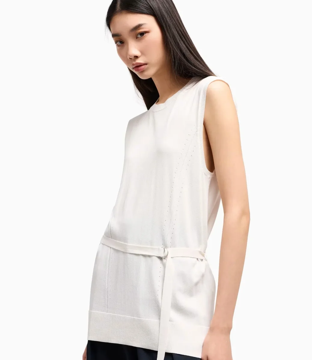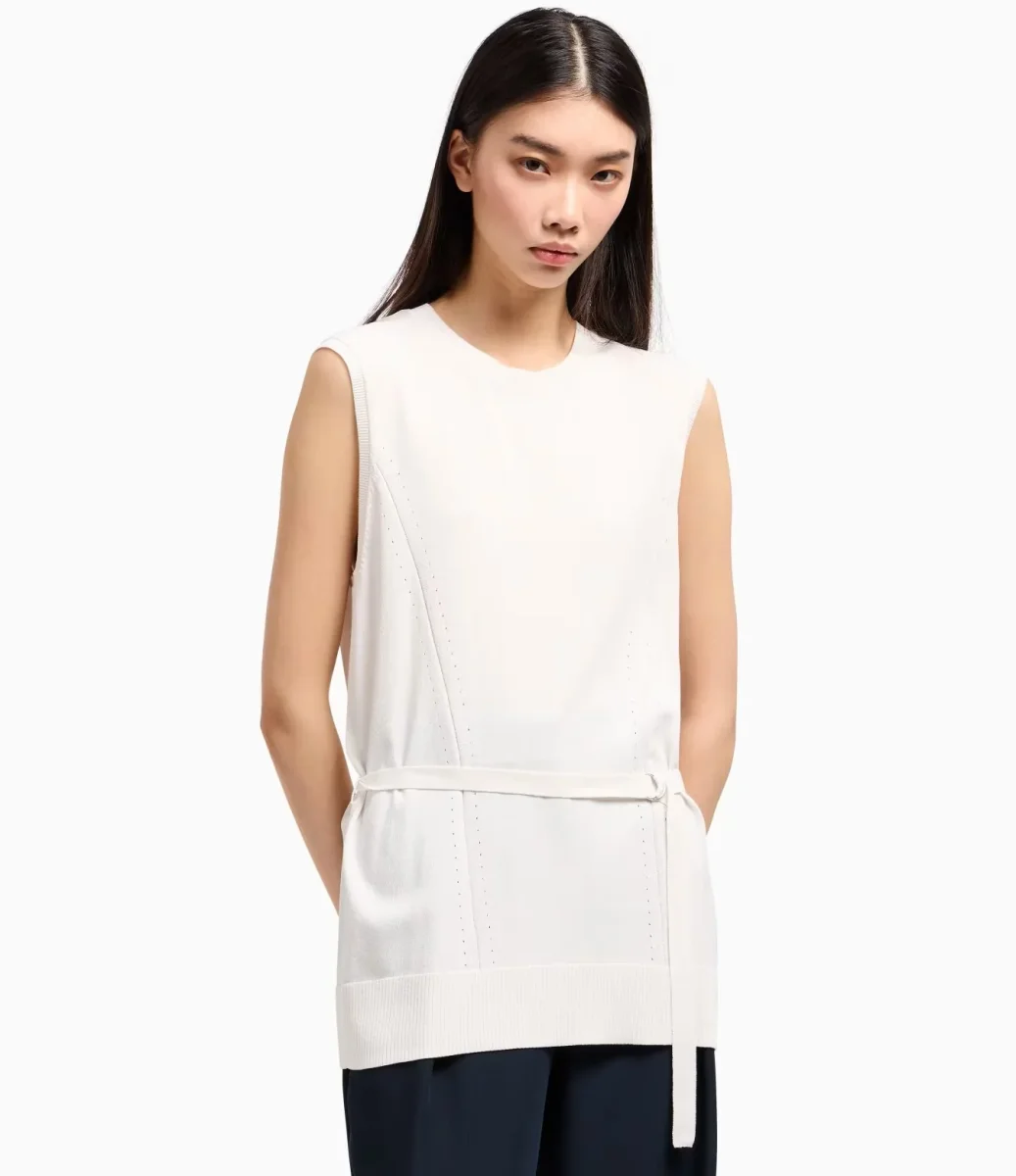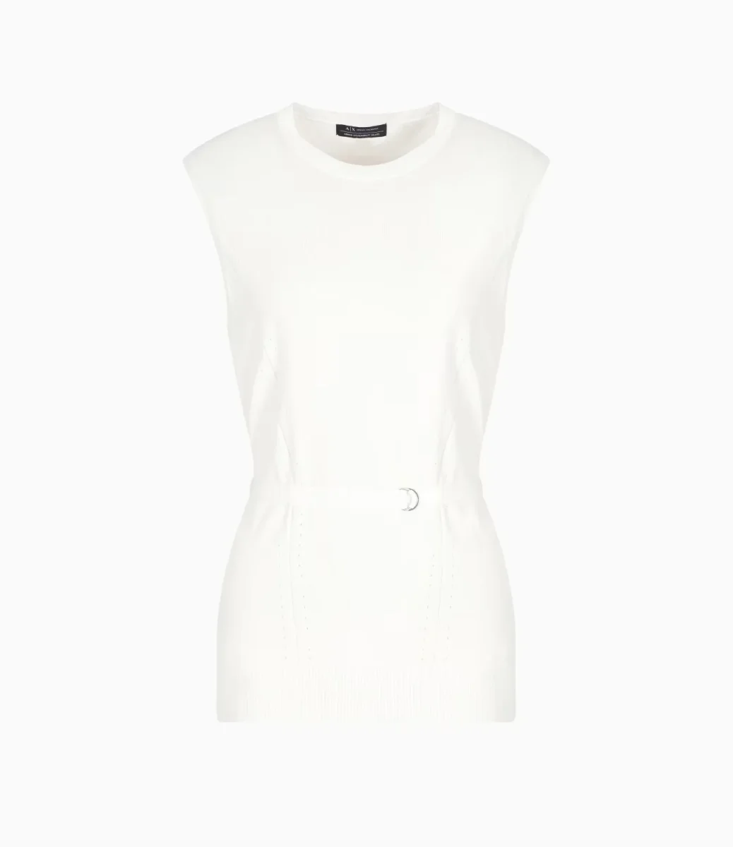 Top donna bianco in maglia sottile, leggero e confortevole. Scollo tondo essenziale e cintura coordinata nello stesso tessuto, arricchita da un elegante dettaglio in metallo. Perfetto per look femminili dal tocco sofisticato e moderno.