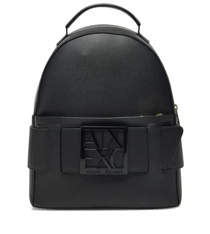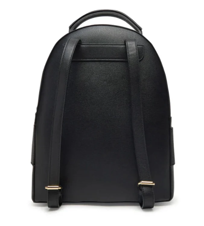 Zaino da donna nero in ecopelle e tasca frontale, manico singolo con bretelle regolabili, tasca anteriore e scomparto centrale chiusi con zip, interni foderati con la presenza di 1 tasca multiuso.