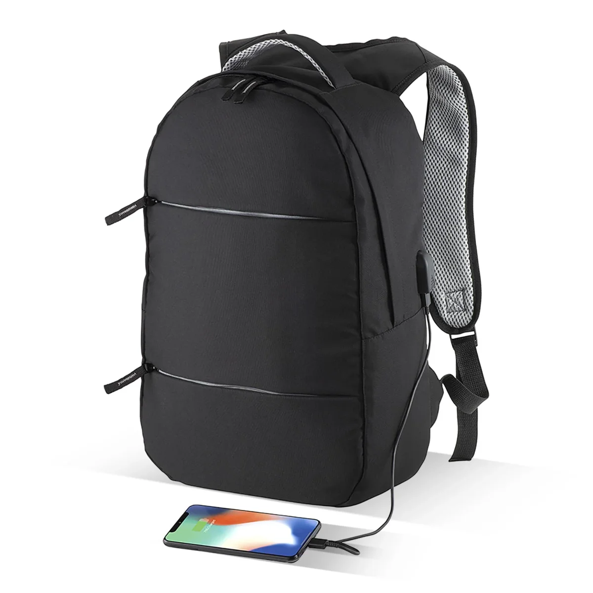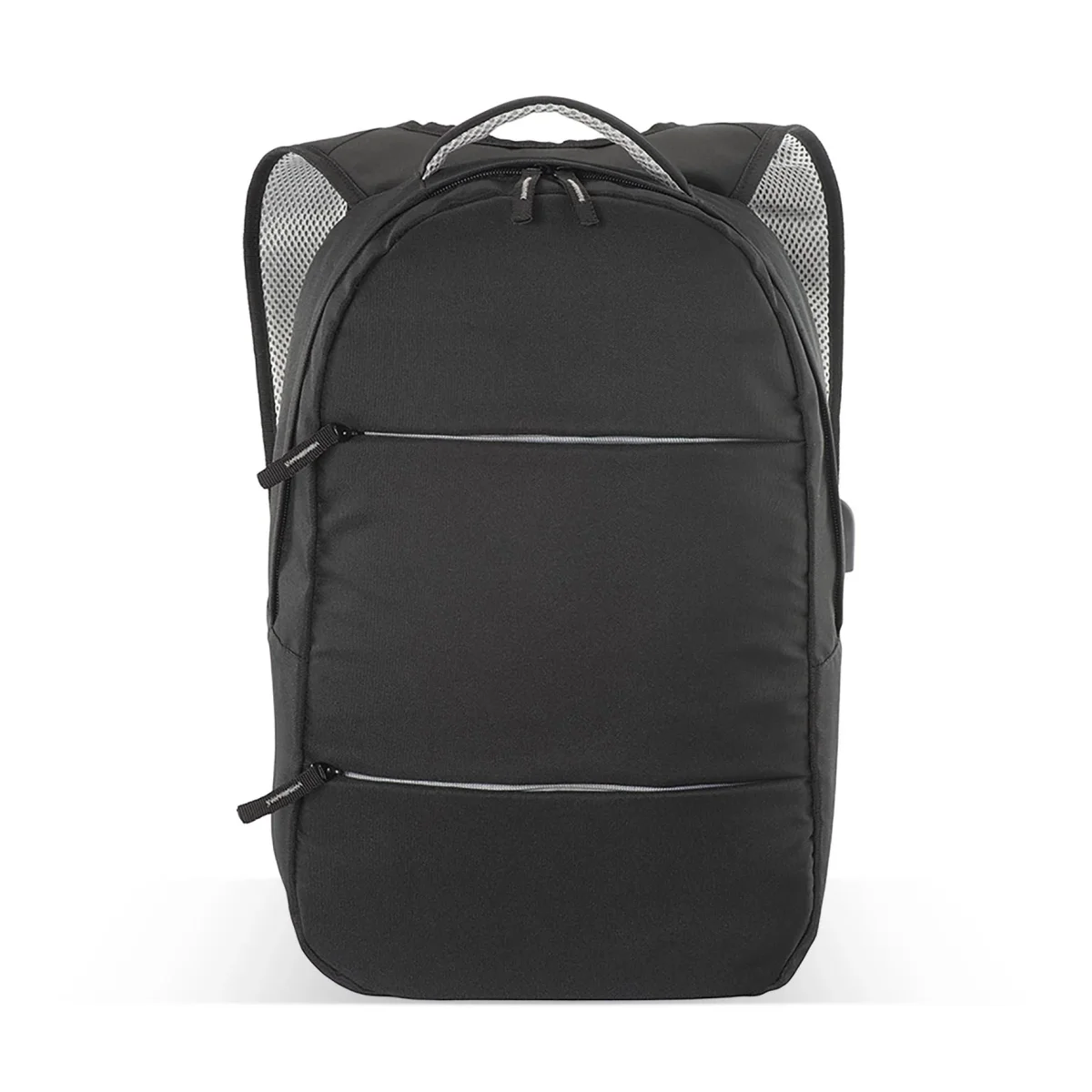 Zaino porta computer con tasca principale porta pc [15″] e 3 tasche frontali. Spallacci imbottiti con materiale traspirante. Porta USB esterna per connessione a power bank [non fornita].