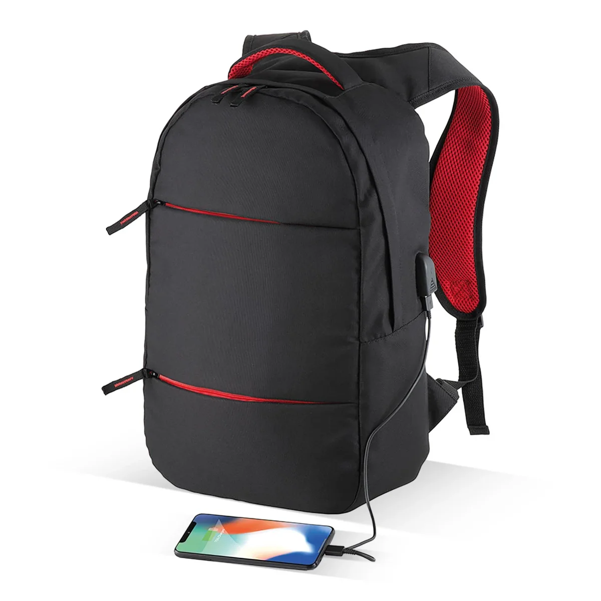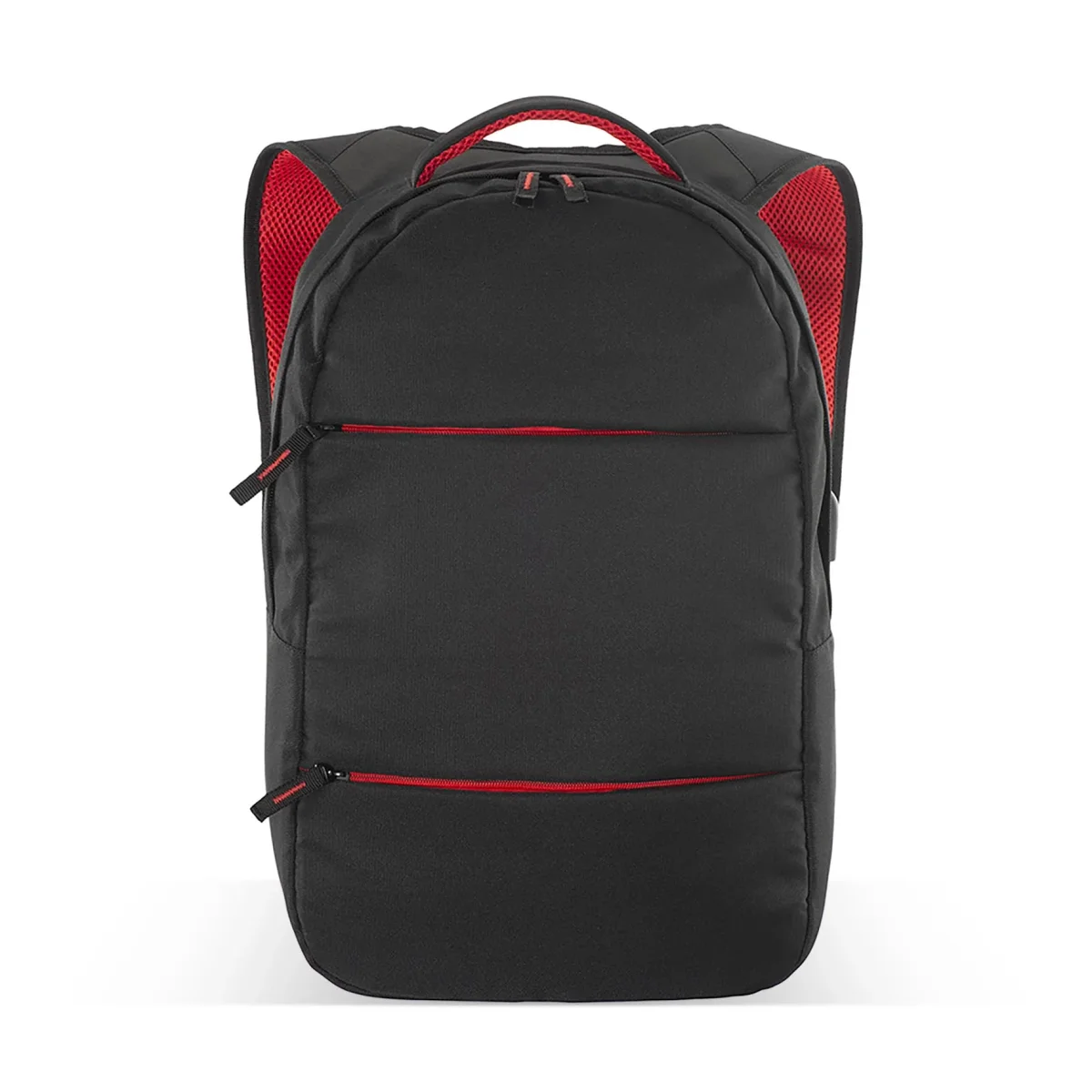 Zaino porta computer con tasca principale porta pc [15″] e 3 tasche frontali. Spallacci imbottiti con materiale traspirante. Porta USB esterna per connessione a power bank [non fornita]. Poliestere 600D Dimensioni: 28x42x11 Colori disponibili: Nero/Rosso e Nero/Grigio