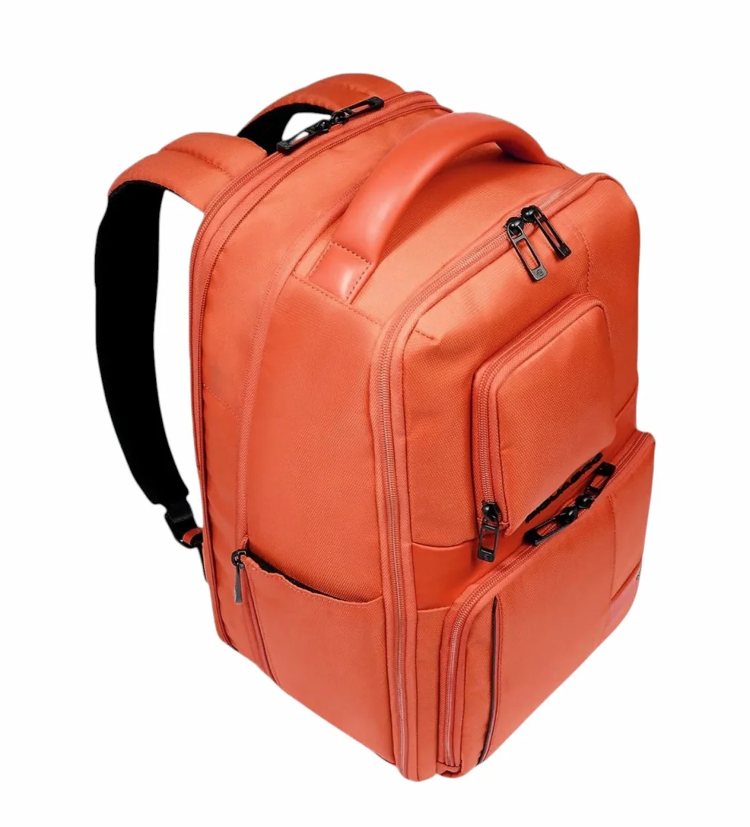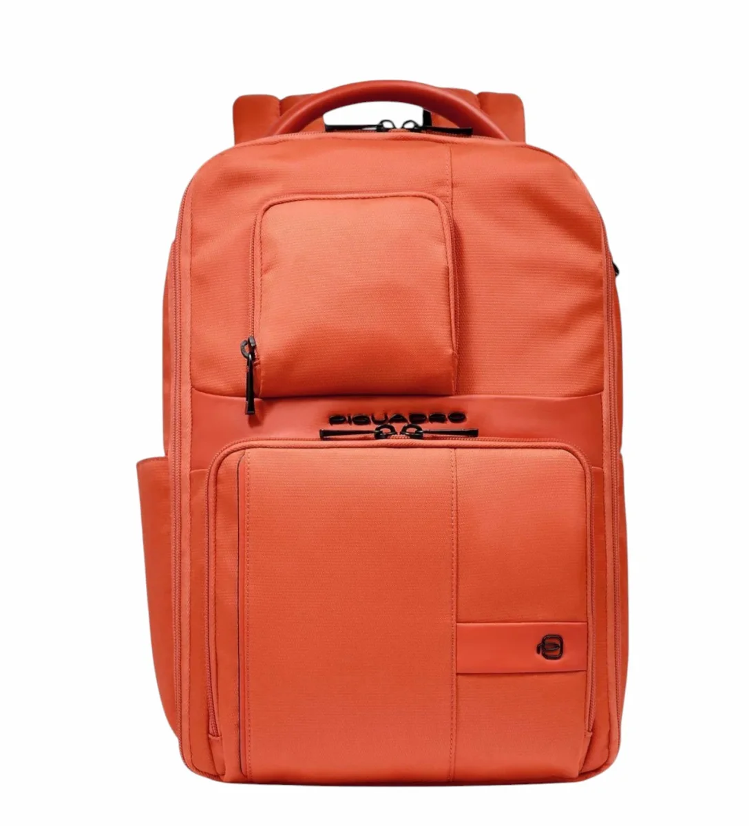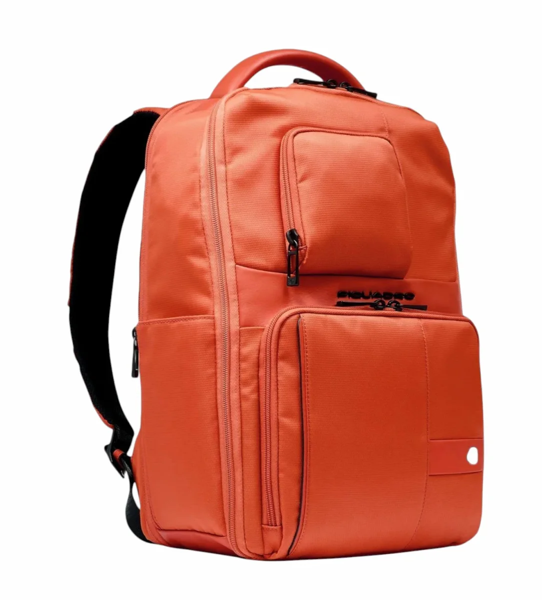 Zaino unisex arancio in tessuto riciclato e pelle, porta pc e iPadยฎ, protezioni antiurto e RFID, tasca porta bottiglia, tasche interne multifunzioni con scomparti, due tasche sul davanti con zip, spallacci regolabili, chiusura con zip.