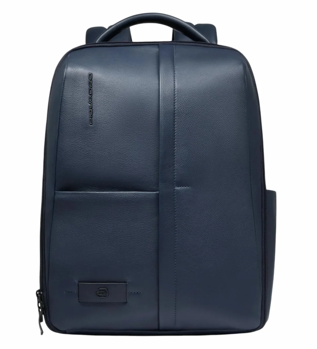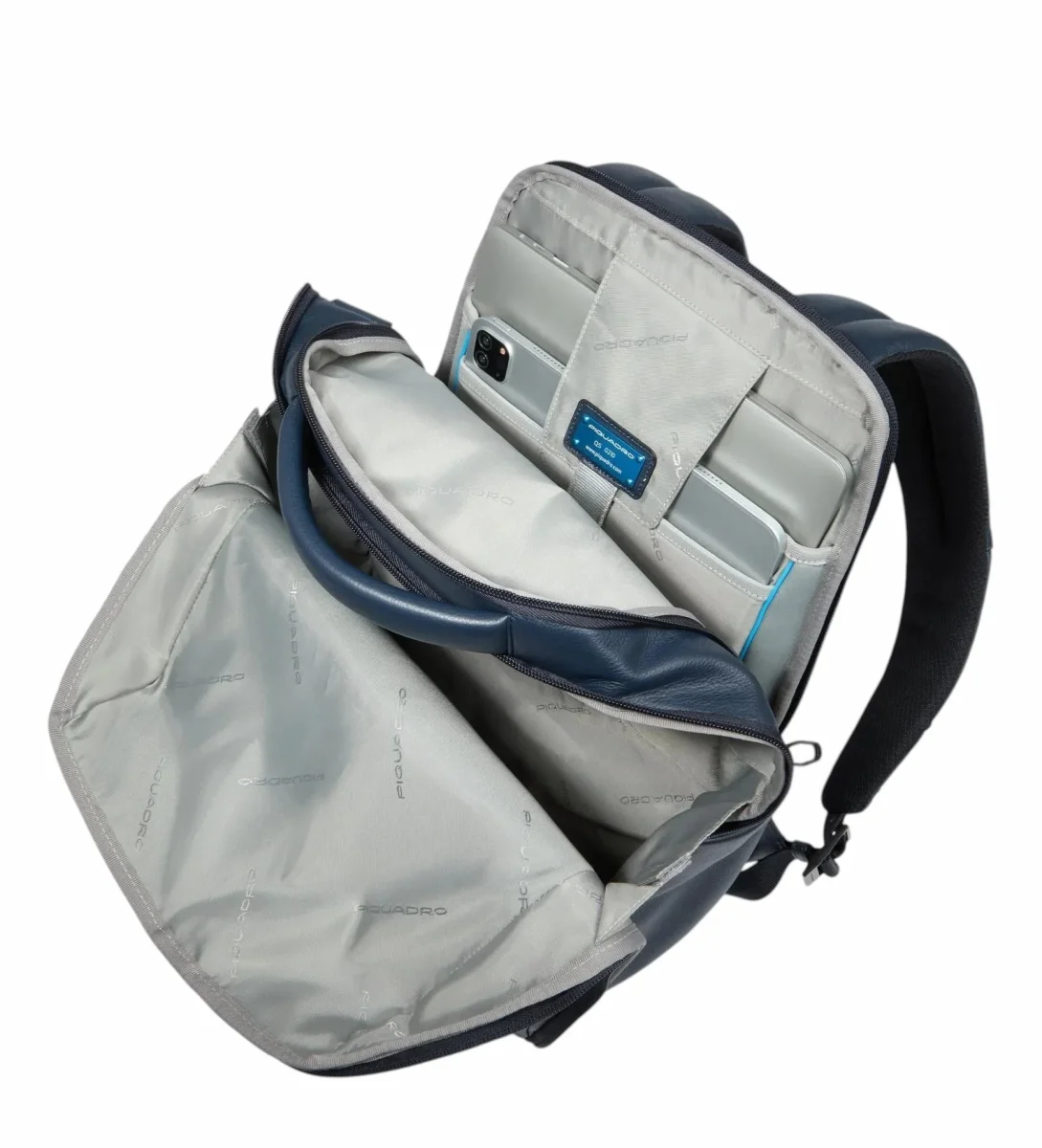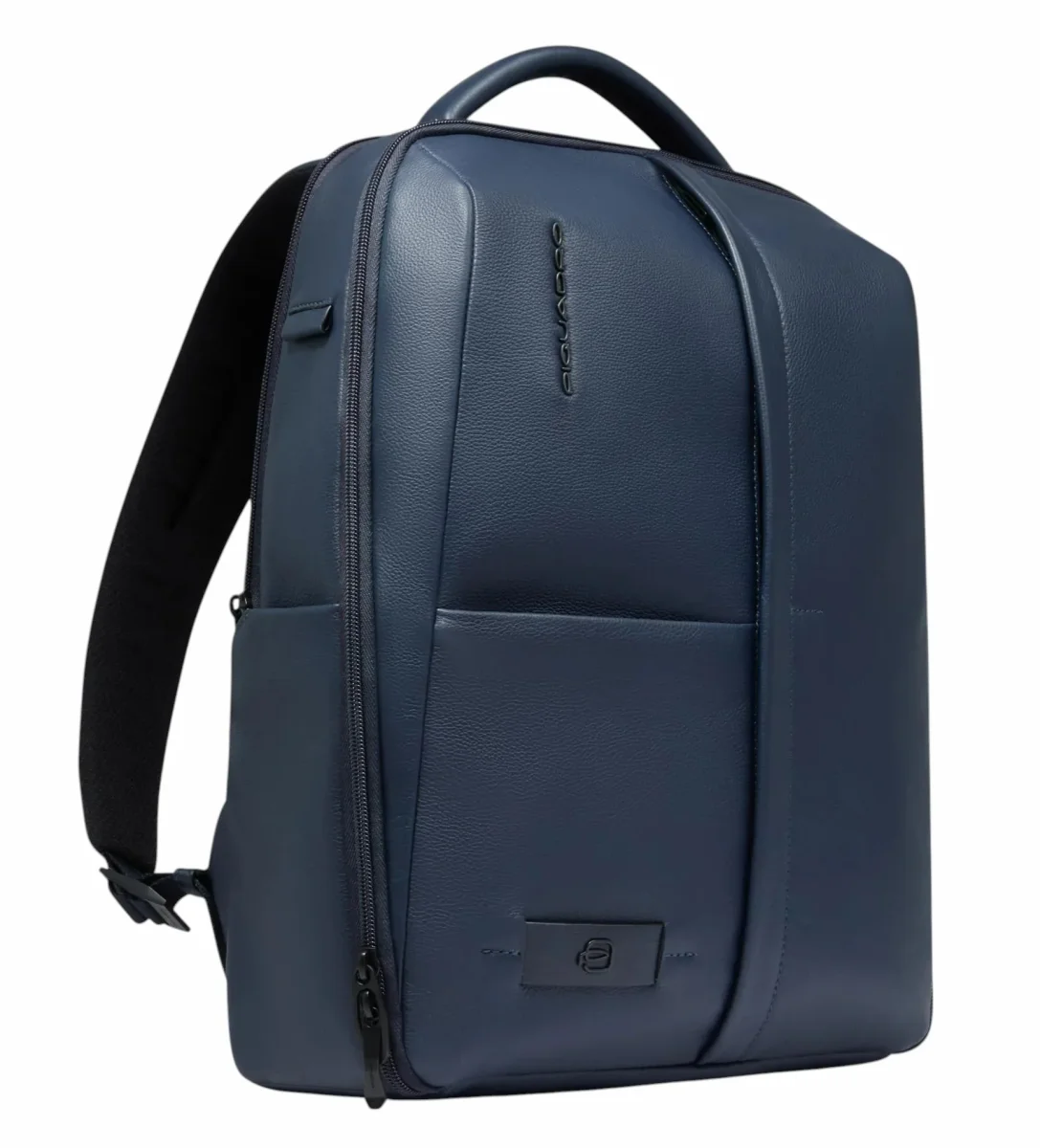 Zaino uomo blu in pelle, porta pc e iPadยฎ con sistema di sicurezza antifurto, portaocchiali, tasca per Piquadro Smart Tracker, protezioni antiurto e RFID