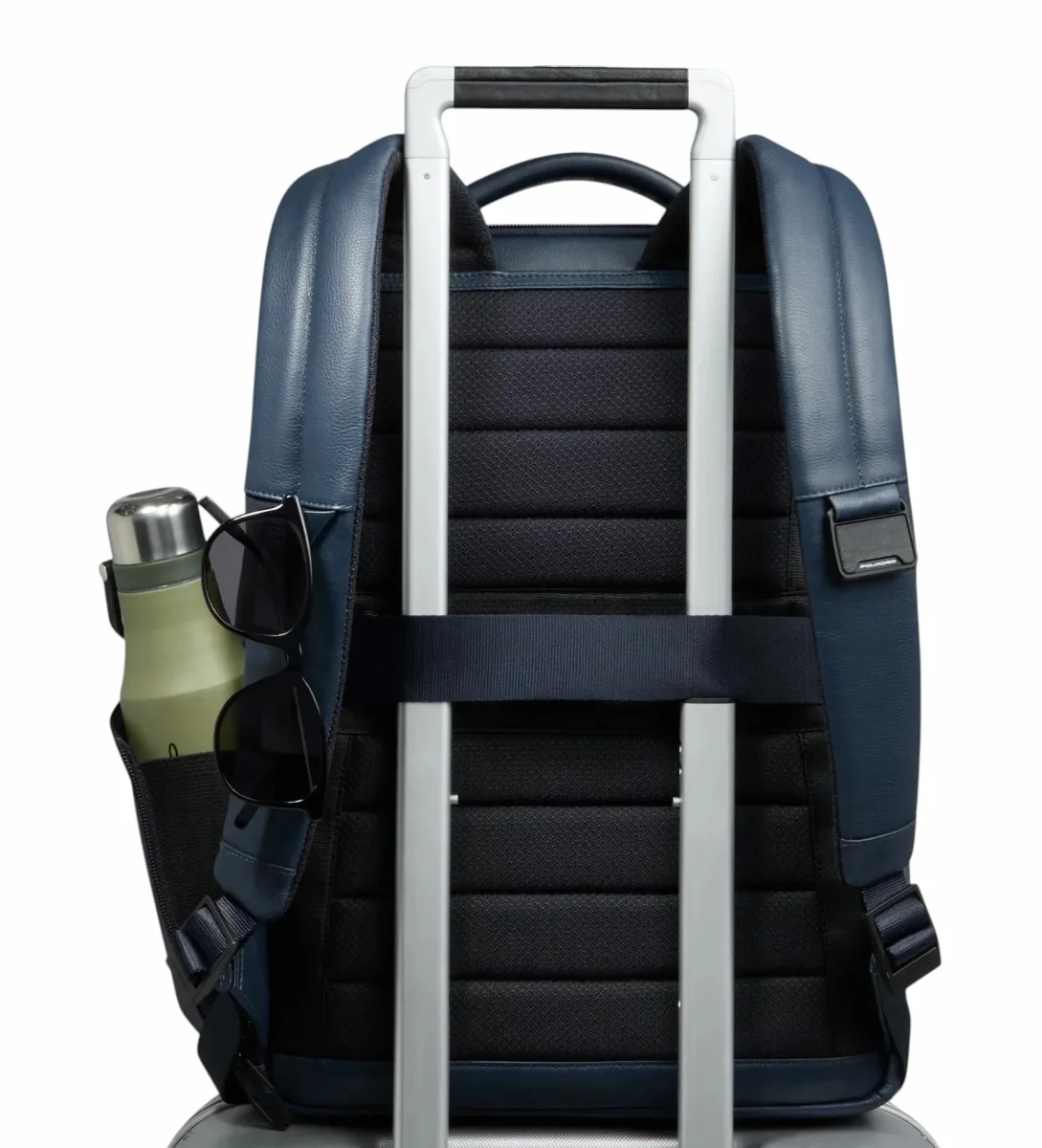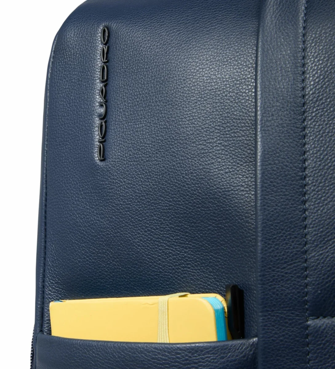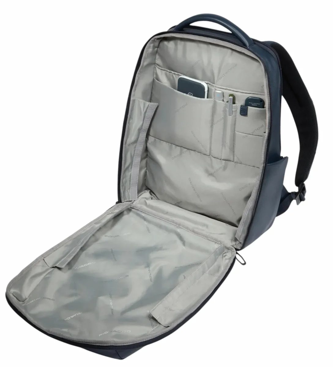 Zaino uomo blu in pelle, porta pc e iPadยฎ con sistema di sicurezza antifurto, portaocchiali, tasca per Piquadro Smart Tracker, protezioni antiurto e RFID