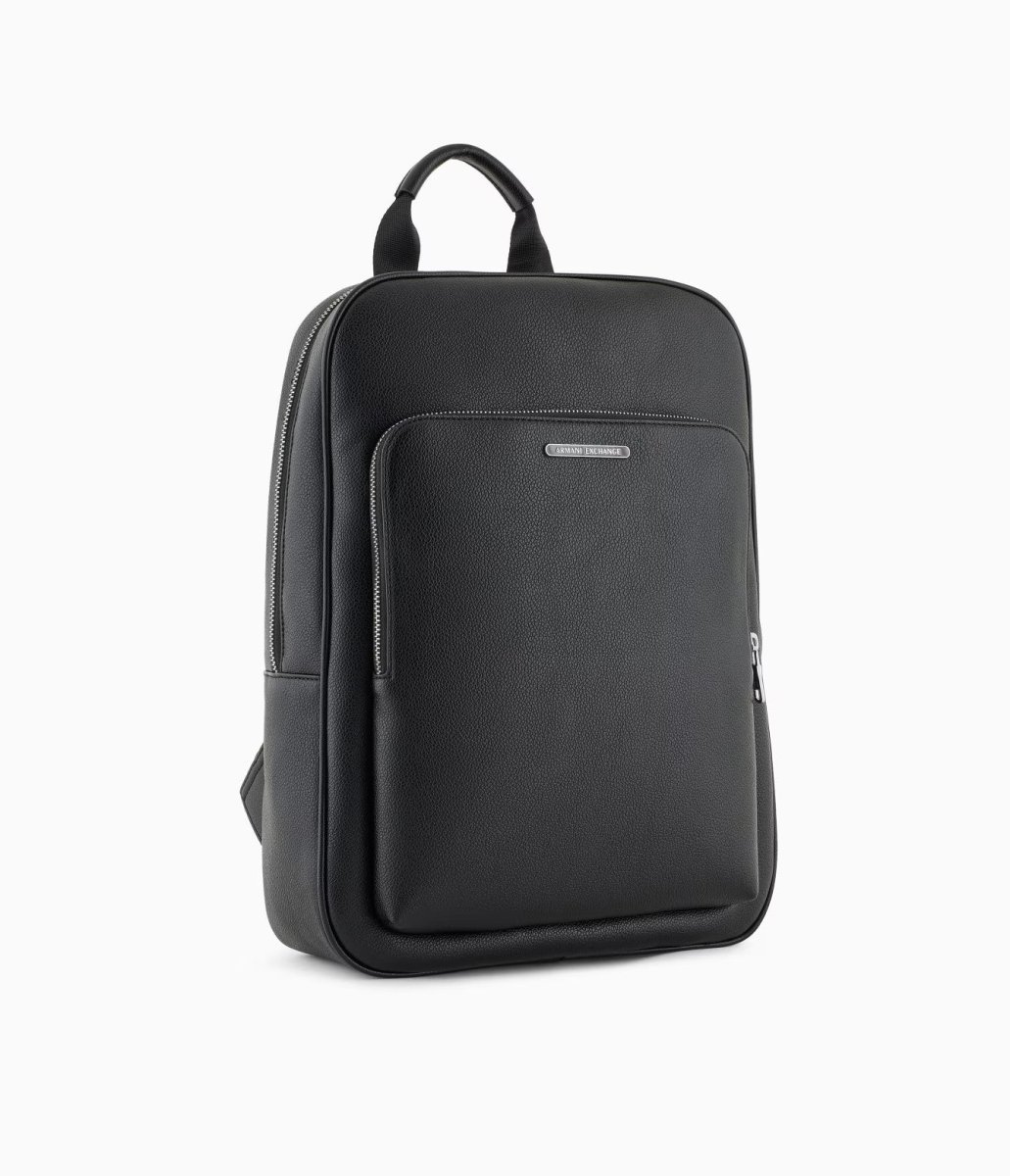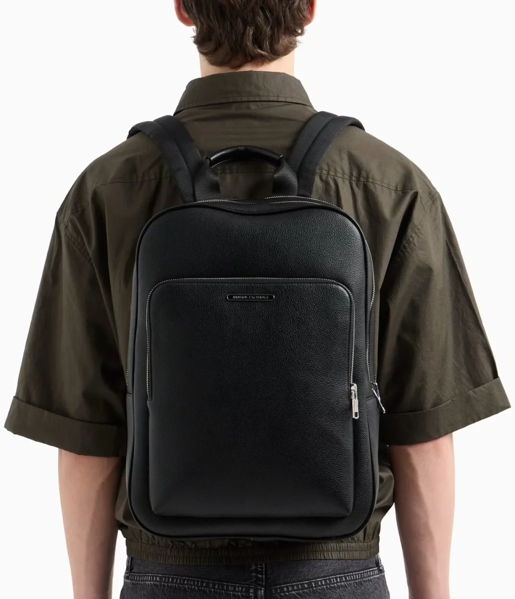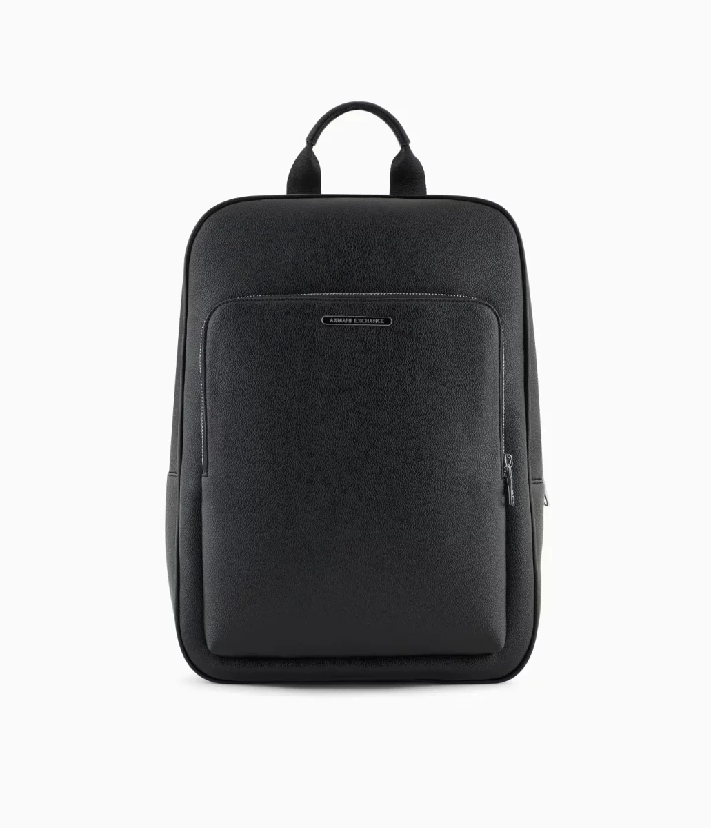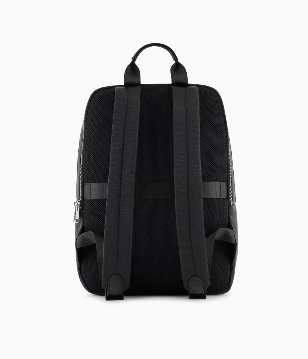 Zaino uomo nero in ecopelle dalle linee essenziali e look pulito con tasca frontale con zip e scomparto principale capiente, manico superiore e spallacci regolabili, interno organizzato con scomparti multipli.